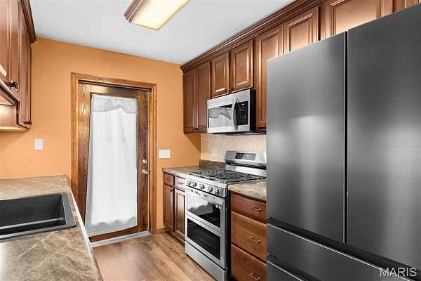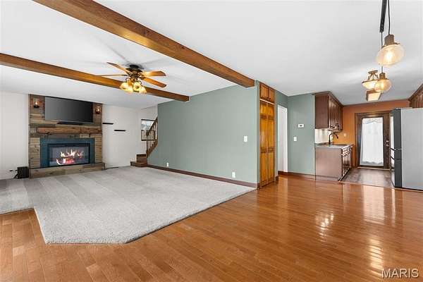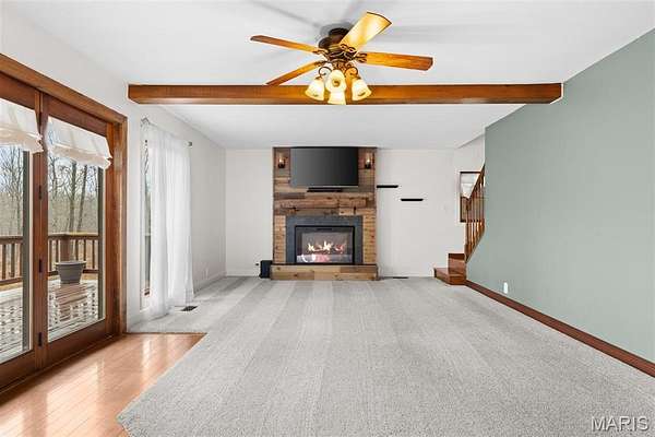From the expansive front deck, you step into the living room, where abundant natural light, updated carpet, and a newly installed gas fireplace and surround create a welcoming focal point. The kitchen showcases new flooring and updated appliances (2024) and provides direct access to the large back deck, ideal for entertaining or enjoying quiet mornings overlooking the woods.