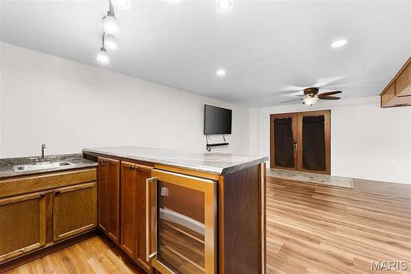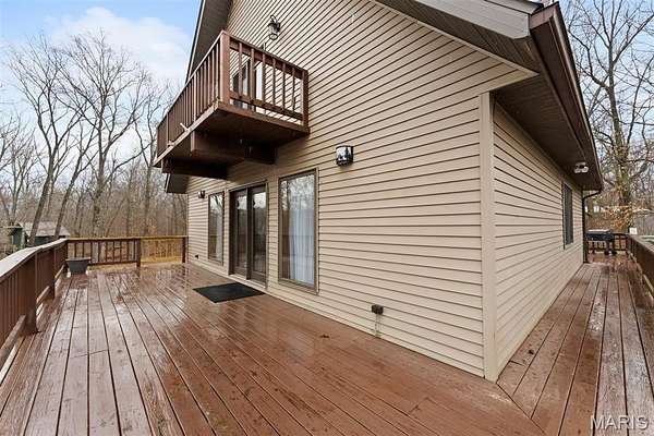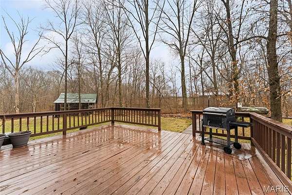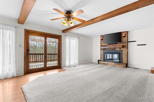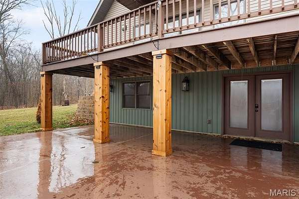 The finished walkout lower level expands your living space with updated flooring, a wet bar, and a newly added beverage cooler (2024). Double doors lead to a covered concrete area beneath the deck, framed by cedar-wrapped posts and offering shaded outdoor space.