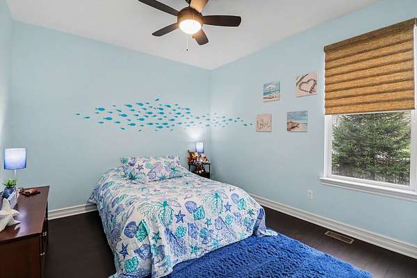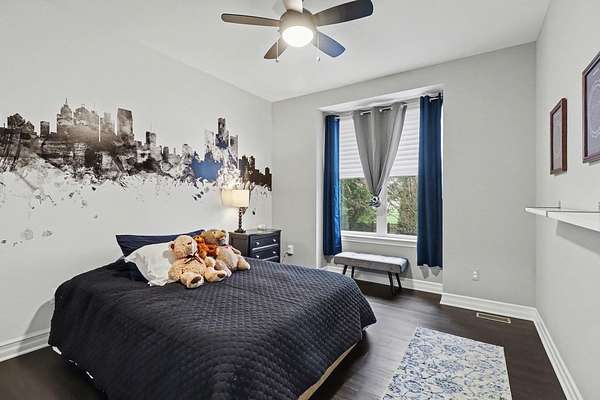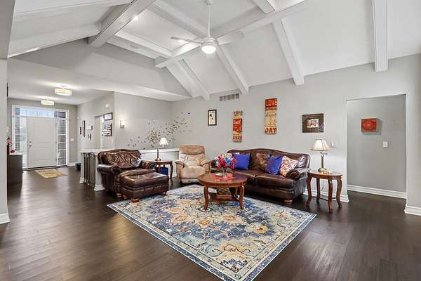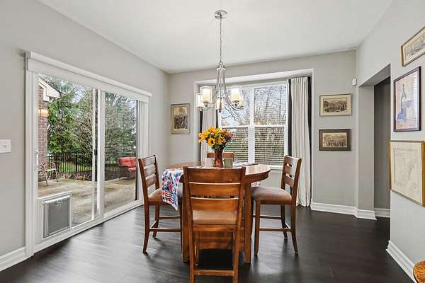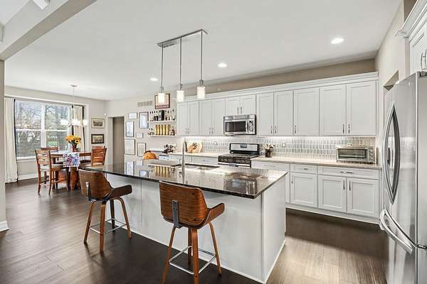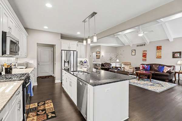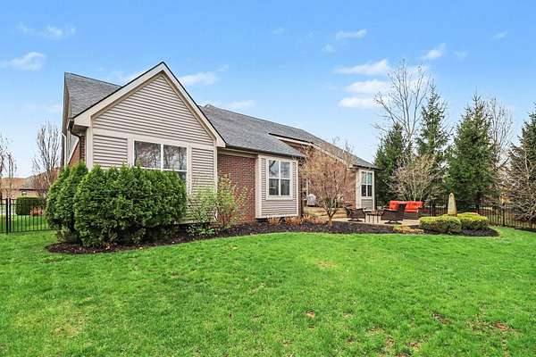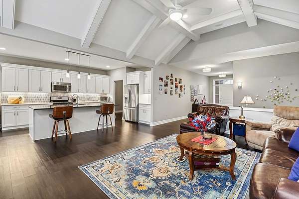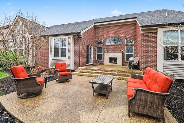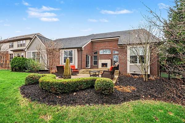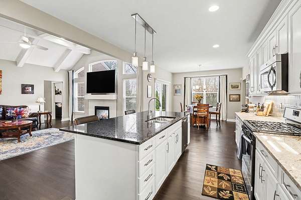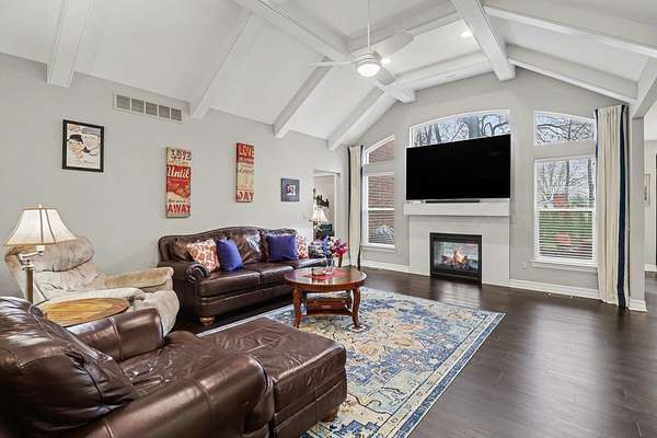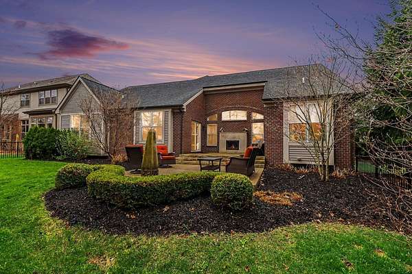This stunning 3-bedroom, 2.5-bath ranch offers over 2,400 sq ft of beautifully finished living space with high-end finishes throughout. The open layout features engineered flooring, granite in the kitchen and baths, and a chef-inspired kitchen with a large island, premium cabinetry, and designer backsplash. The vaulted family room showcases dimensional beams and a striking two-way indoor/outdoor fireplace, seamlessly connecting to the outdoor living space. A bay-window study is perfect for working from home, while the extended owner's suite adds comfort and privacy. The finished basement includes an impressive 36' x 33' workout or recreation area. Additional highlights include ceiling fans in all bedrooms and a 3-car garage. Outside features professional landscaping, sprinkler system, aluminum fencing, new sod, gutter guards, and a built-in dog door. Move-in ready!
