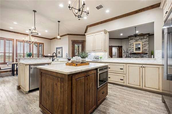 Set behind a sweeping circular drive & framed by a beautifully manicured lawn, this exceptional custom-built coastal country residence makes a striking first impression. Timeless stonework paired with warm wood elements welcomes you into a foyer where impeccable craftsmanship meets coastal elegance. The expansive living area is highlighted by a stone-faced fireplace and opens gracefully to a generous covered patio with a fully equipped outdoor kitchen-an ideal setting for refined entertaining. Overlooking the outdoor living space, a stocked pond provides a serene, pastoral backdrop, while native wildlife such as herons, egrets, & occasional deer add a touch of natural beauty. The private primary retreat offers a luxurious walk-through dual-head shower and an impressive 13x13 wardrobe complete with a custom-built island-thoughtfully designed for both beauty & function. The open-concept kitchen is equally impressive, featuring leathered granite countertops, a substantial island with breakfast bar, double convection ovens, a 64" built-in refrigerator/freezer, microwave drawer, beverage cooler, solid wood custom cabinetry, & an expansive walk-in pantry. Designed with efficiency & longevity in mind, the home includes an oversized garage, dual water heaters, & a whole-home water system with softener, chlorinator, & charcoal filtration. Additional highlights include a metal roof, impact-rated double-pane windows, dual A/C systems with Nest thermostats, a 20-zone irrigation system, stairway access to a decked attic, dehumidifier, spacious laundry room, plantation shutters throughout, as well as a dedicated private room/game room. Completing the property is a workshop with an elaborate carport, ideal for hobbies, storage, or accommodating recreational vehicles. This truly one-of-a-kind home offers a refined balance of timeless design, modern amenities, & elevated coastal country living.