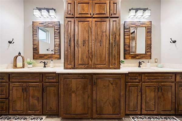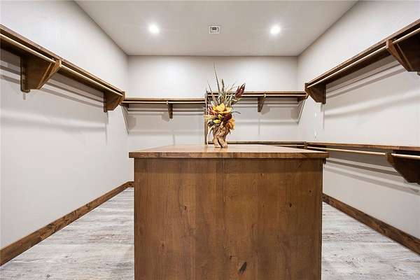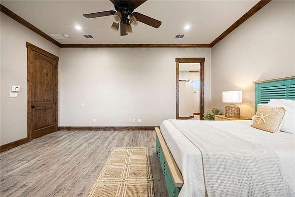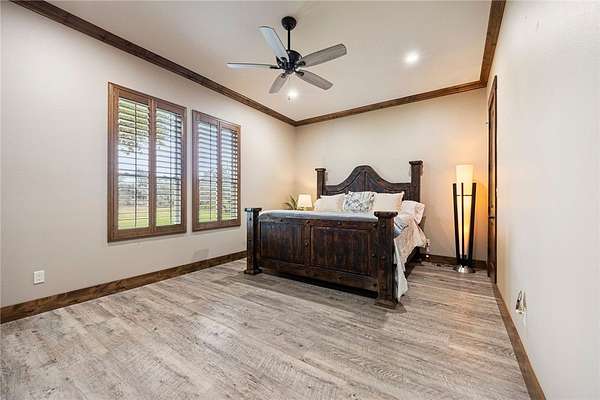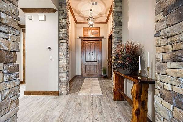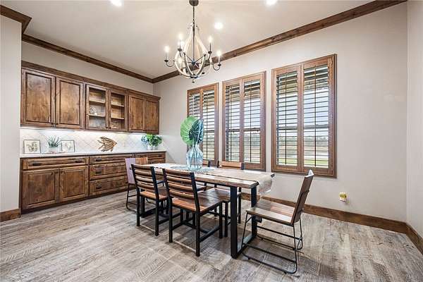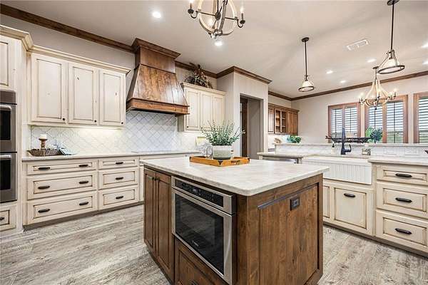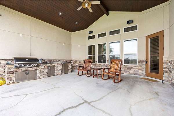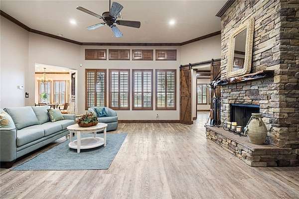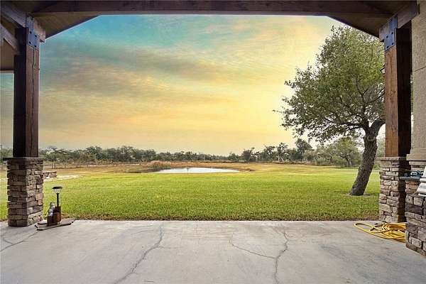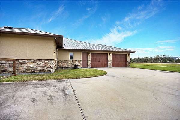 Set behind a sweeping circular drive on a beautifully manicured lot, this custom-built coastal country home delivers luxury, space, and privacy in one exceptional package. Timeless stonework and warm wood accents create a stunning first impression, leading into a grand foyer showcasing impeccable craftsmanship throughout. The open-concept living area features a striking stone fireplace and flows seamlessly to a covered patio with a fully equipped outdoor kitchen, perfect for entertaining and everyday enjoyment. Beyond the outdoor living space, a stocked pond offers peaceful views and frequent sightings of herons, egrets, and native wildlife. The primary suite is a true retreat, highlighted by a spa-inspired walk-through dual-head shower and an expansive 13x13 custom walk-in closet with built-in island. The chef's kitchen is designed to impress with leathered granite countertops, oversized island with breakfast bar, double convection ovens, 64" built-in refrigerator/freezer, microwave drawer, beverage cooler, custom solid wood cabinetry, and a large walk-in pantry. Additional features include an oversized garage, metal roof, impact-rated double-pane windows, dual A/C systems with Nest thermostats, dual water heaters, whole-home water filtration system, plantation shutters throughout, spacious laundry room, dedicated game or flex room, stair access to a decked attic, dehumidifier, and a 20-zone irrigation system. Completing the property is a workshop with an extended carport, ideal for hobbies, storage, boats, or RV parking. This one-of-a-kind home offers a rare combination of refined design, modern efficiency, and elevated coastal country living-perfect for buyers seeking space, privacy, and luxury just minutes from the coast.