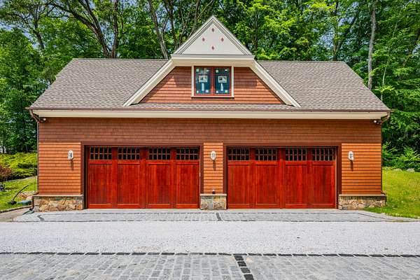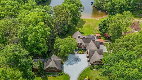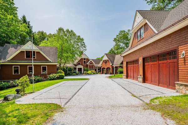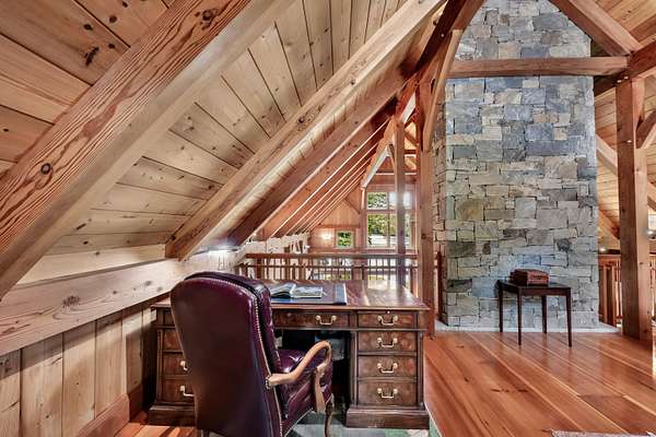 Grand post and beam home with level lake frontage and views, babbling brook, main level master suite, 9+ car garage, finished walk-out, and unfinished loft spaces for potential for expansion all set on 1.86 acres in a small gated community. Wide plank king's planking, exposed post and beam and cathedral ceilings in almost every room. Views from multiple rooms. Main level master suite with corner fireplace, walk-in closet, and attached full bath with soapstone flooring and surround. Eat-in-kitchen with Poggenpohl cabinets, stainless steel Viking appliances including 4 burner cooktop and griddle, double oven, and bev fridge. Breakfast nook overlooking the lake. 2 story great room rows of windows to capitalize on views and 2 story fireplace. Secondary bedroom suite also on main level. Dining room, office, laundry room, and powder room finish off main level. Upstairs separate loft with views. 3rd and 4th bedrooms upstairs with additional full bath. Lower level rec room with fireplace and walkout. Additional bedroom and full bath with separate lower level entry. Room for 9+ cars includes attached 3 car, detached 2 car, and detached 4 car garages. The 4 car garage has High bays that can accommodate lift, high doors, and an insulated and framed loft space. 2 car garage has a loft space and addition with access to plumbing and septic. Many possibilities for more living space. Whole home generator, dual 200 amp service, CAIR, radiant heat, irrigation, cameras, copper gutters,