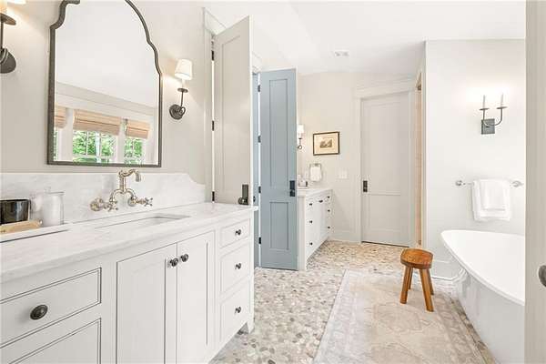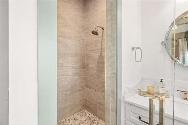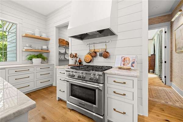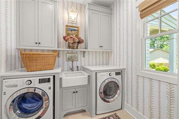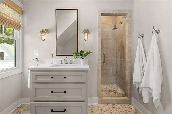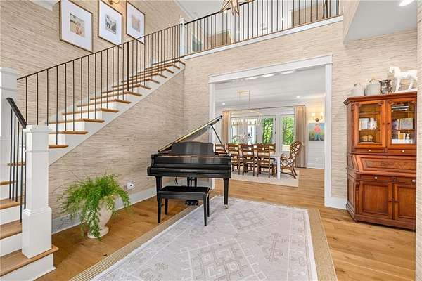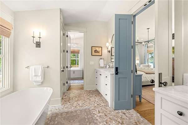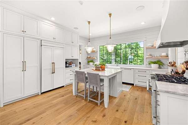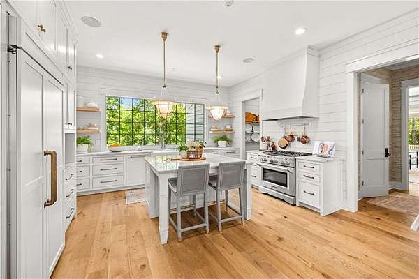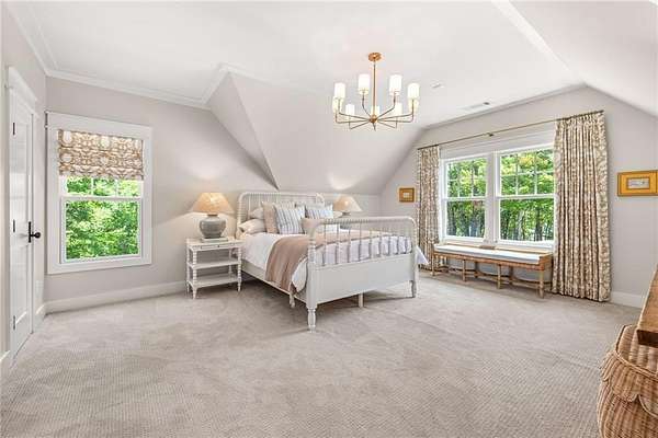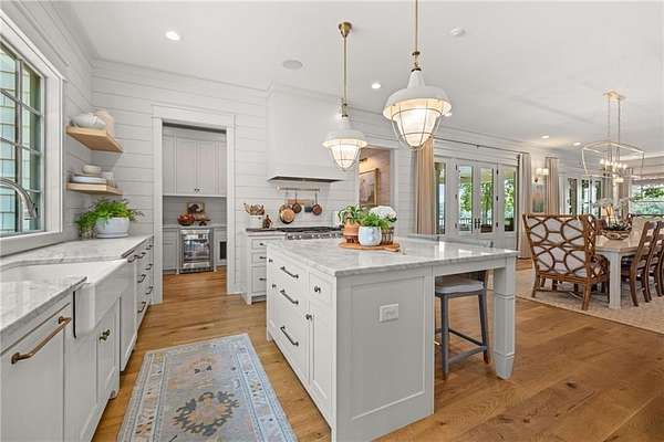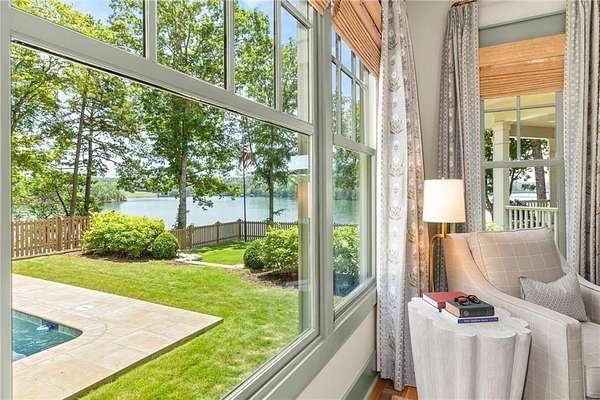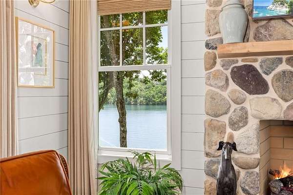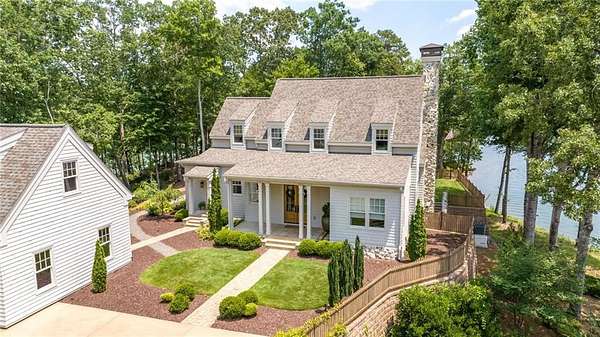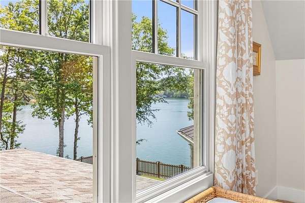 Southern coastal charm meets Lake Lanier luxury in this exceptional custom-designed estate, perfectly positioned on a private point lot surrounded by water and breathtaking lake views. Tucked away behind private gates and down a long, secluded driveway, this stunning home offers the ultimate in resort-style living, just minutes from the Chattahoochee Country Club and its private marina. Designed by renowned architect Stephen Fuller, this four-bedroom, four and a half bath residence blends timeless architecture with modern luxury. The home features a hardy shake and river rock exterior, beautifully landscaped shoreline with river rock detailing, and year round views from nearly every room. A heated pool, level fenced backyard, covered back porch, and two detached two-car garages complete the outdoor oasis. Inside, the open-concept layout is filled with natural light and framed by walls of glass, maximizing the lake views. The two-story foyer opens into a vaulted great room with a stone fireplace and an elegant dining space. The gourmet kitchen is a chef's dream, with quartzite countertops, a large island, custom cabinetry, stainless steel appliances including a six-burner gas range, and a spacious prep pantry that doubles as a bar and entertaining space. The main-level primary suite is a serene retreat with views of the pool and lake, and a spa-inspired bath featuring a soaking tub, dual vanities, custom shower, and two walk-in closets. A second main-level bedroom and full bath offer flexibility for guests or a home office. Upstairs, a central gathering area leads to two generous en-suite bedrooms with custom closets. Additional highlights include a welcoming office area off the kitchen, a large laundry room, and an unfinished daylight terrace level with approximately 2168 square feet ready to be customized. Modern conveniences abound, with a whole-house generator, natural gas for cooking, fireplaces, heating, and pool, plus an irrigation system, professional landscaping, and outdoor lighting. This home is a rare opportunity to enjoy the best of lakefront living, thoughtfully designed for both everyday comfort and exceptional entertaining.