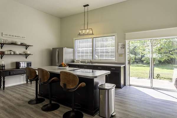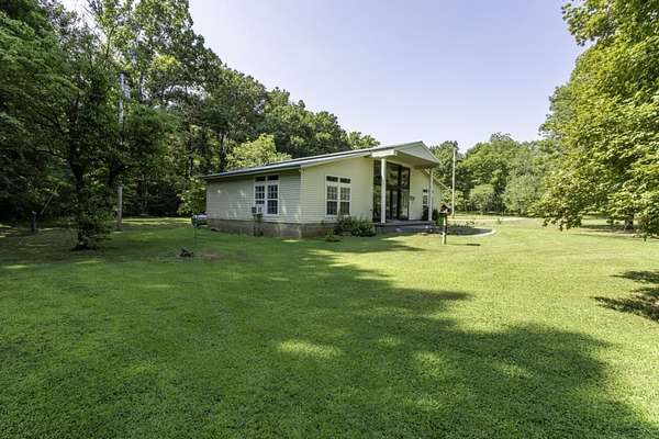 This country home for sale near Hardy, Arkansas sits on 21 wooded acres and features a creek along the property, a small hunting cabin, open-concept living, and close proximity to the Spring River in the heart of the Ozarks.