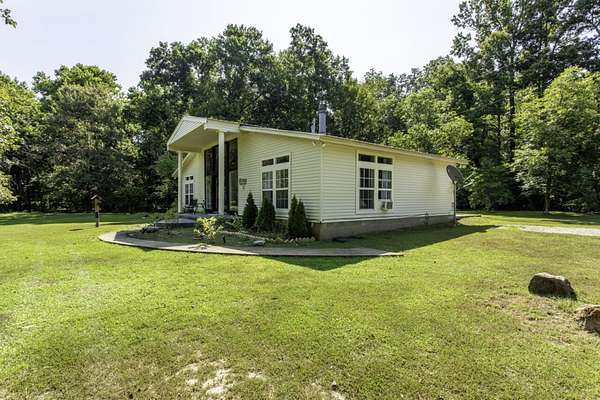 Outdoor living spaces include a small front porch and a rear concrete patio, ideal for enjoying the surrounding woods and peaceful setting.