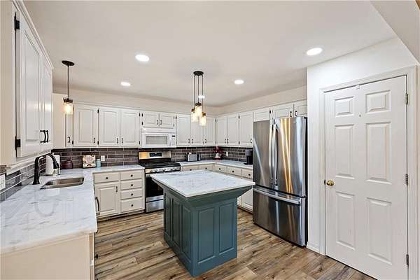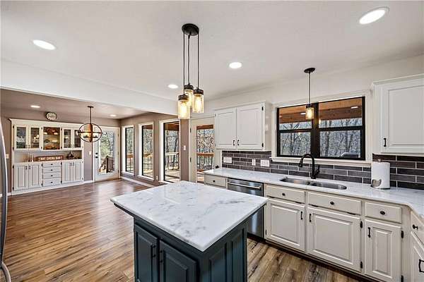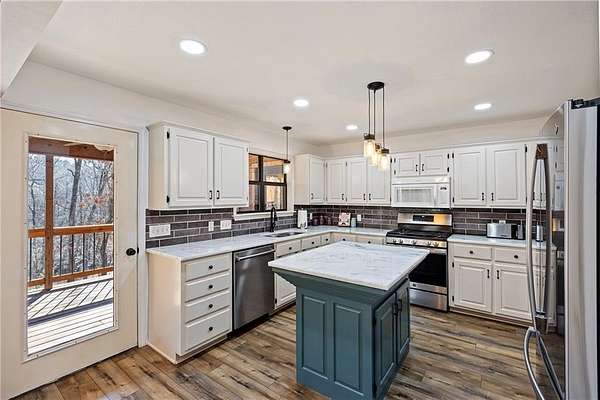 The updated kitchen is a standout, showcasing white cabinetry, modern lighting, stainless steel appliances, stylish backsplash, and a large island. Updated flooring, fresh paint, and new lighting flow throughout the home, blending rustic charm with a clean, modern feel. Built-ins and a cozy fireplace add warmth and character to the living areas.