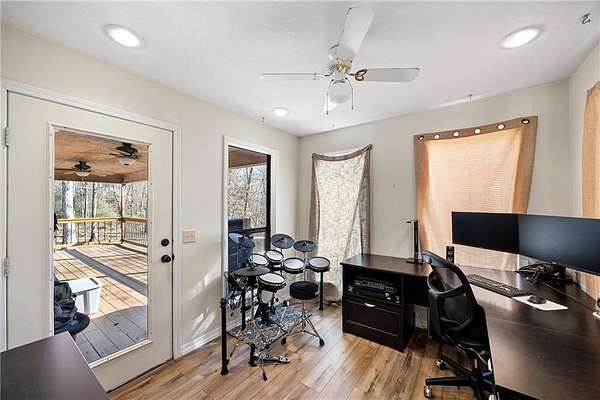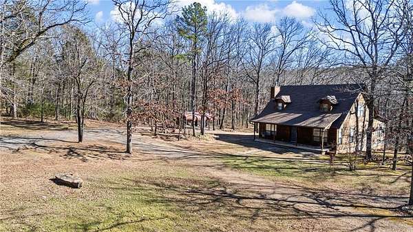 Nestled in a private, wooded setting, this cabin-style home offers approximately 2,000 square feet of warm character and updates. The exterior features rich wood siding, dormer windows, and a welcoming covered front porch that sets the tone for peaceful living. Inside, the home offers 4 bedrooms, 2 full bathrooms, and 2 half bathrooms, along with a dedicated office and utility room for added flexibility.