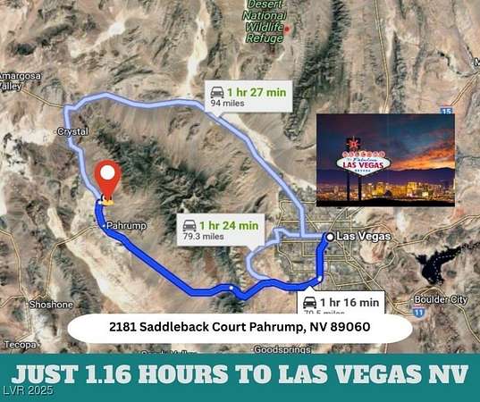 From Las Vegas, take NV-160 towards Pahrump to E Simkins Road. Continue on Simkins Road to Panorama Road. Panorama Road to Saddleback.