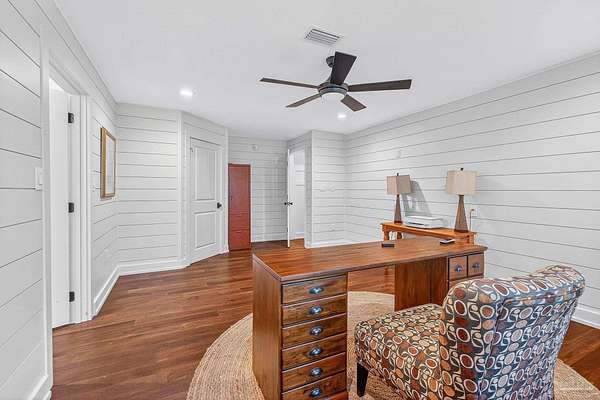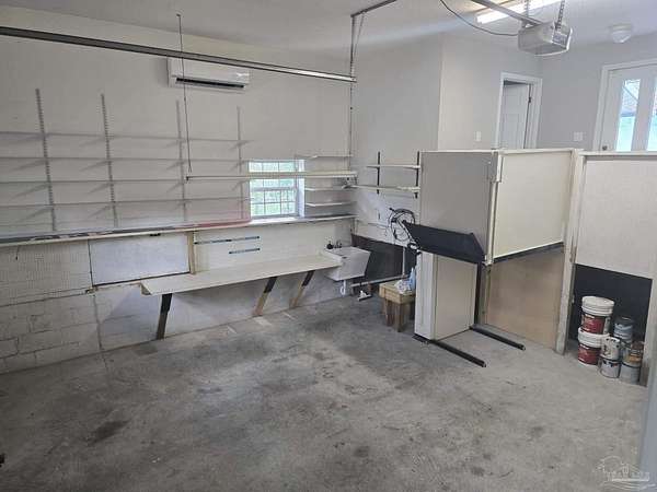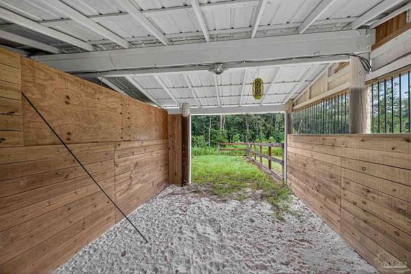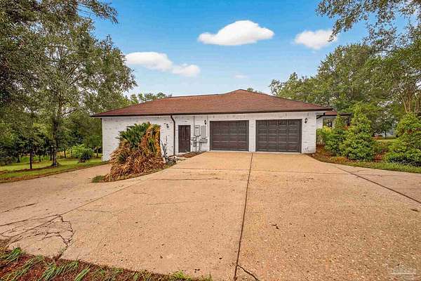 When is the last time you saw deer in your yard? Experience the perfect blend of country charm and modern luxury in this custom-built, single-level, off slab foundation brick home set on over six acres of pristine estate land--just 13 miles from I-10 and less than 25 miles from Downtown Pensacola. Designed for comfort, accessibility, and style, this spacious 4 bedroom, 3 and 1/2 bath residence offers high ceilings, wide 3-foot doorways, and 4-foot hallways throughout, creating an open and inviting flow. ~ Inside, rich architectural details elevate every space. Ship lap interior walls, exposed ceiling beams, dark wood trim, and custom cabinetry bring warmth and character, while natural light pours through custom blinds. The kitchen and living areas offer stunning views of the property and open directly to a screened-in pool--designed for easy removal if desired, transforming the space into a large, screened deck perfect for entertaining. ~ This home is packed thoughtful with upgrades, including a geothermal HVAC system, a built-in safe room, and a Generac whole-house generator and large underground propane tank. TWO oversized garages for workshop or crafts! The electric fireplace comes with a flue, ready for conversion to wood-burning, and under-home storage was engineered with future expansion in mind--ideal for a guest suite or bonus living space. A Ring security system adds modern convenience and security. ~ Outside, the estate unfolds into a private retreat. A tranquil pond with a fountain and seating areas invites quiet reflection, while custom trails wind through wooded acreage--and with a little clearing would again be perfect for creekside strolls or golf cart rides. Not to mention a fenced area with a rustic 2 stall barn and tack room complete with lights and running water.