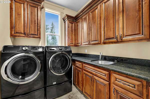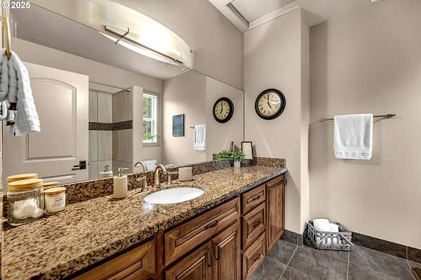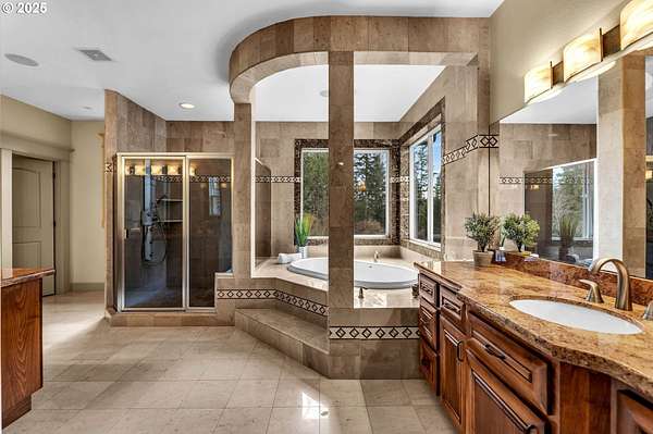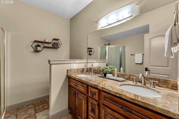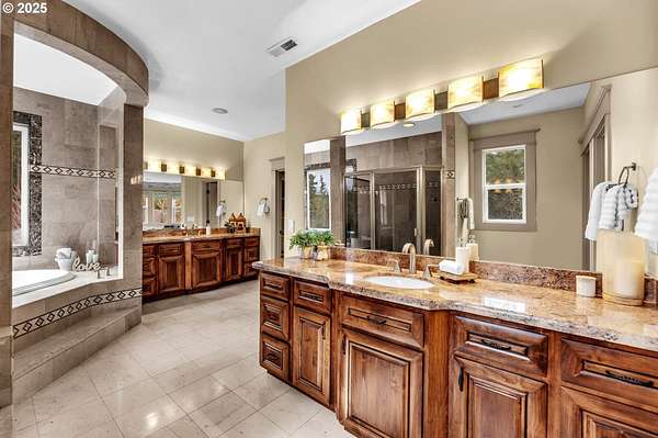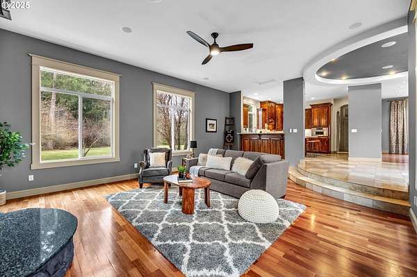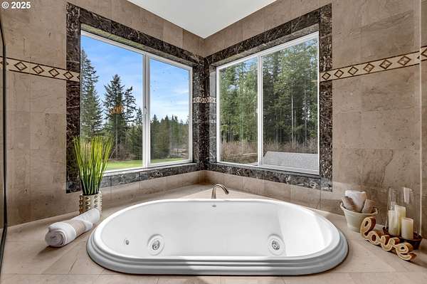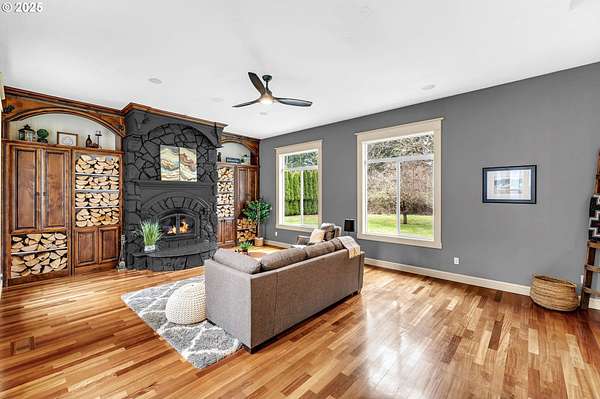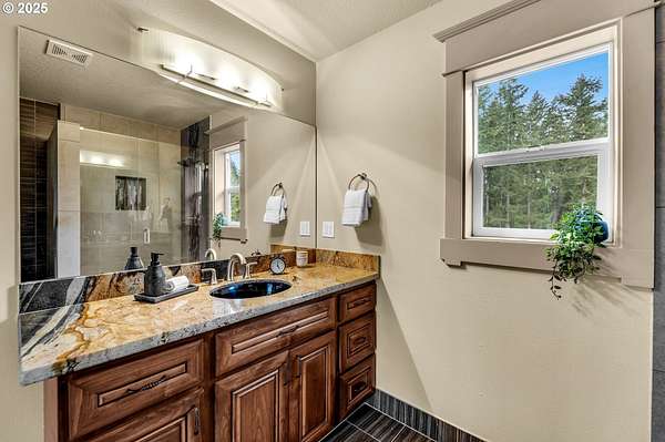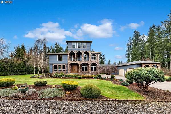 Beautiful Custom-Built Luxury Home on Flat & Usable 2.7 Acres! Total living space 6,641 Sqft with 5 bedroom, 6 1/2 bath which includes detached guest quarters. This spectacular home offers ALL bedrooms with ensuite bathroom, high ceilings throughout the main level, hardwood flooring, NEW Zline 6 burner gas cooktop with electric convection oven, stainless steel appliances, granite countertops, under cabinet lighting, kitchen island w/ prep sink, reverse osmosis water system, tile backsplash, pantry w/ built in shelving, wood burning fireplace, upper & lower level HVAC systems with A/C, ceiling fan, walk-in tile showers, jetted tub, double vanity sinks, laundry room with sink & built in cabinets, central vac system, covered front balcony, detached guest quarters with wood burning sauna, wet bar, detached 4-car garage with breezeway, storage shed, fruit trees, sprinkler system, water feature, RV parking, ample space to build a shop or potential ADU, PLUS MUCH MORE! Only 2 miles from Battle Ground Lake & 5 miles to downtown Battle Ground amenities. Close to gorgeous parks, hiking trails, rivers & waterfalls. This is a MUST-SEE HOME!