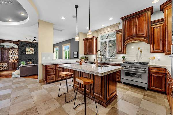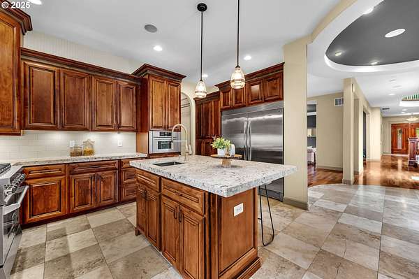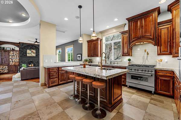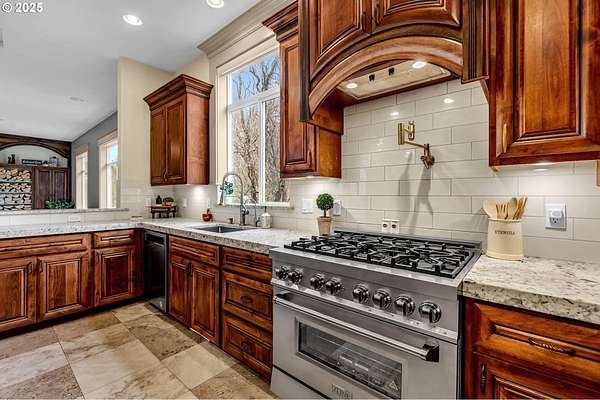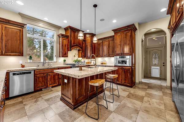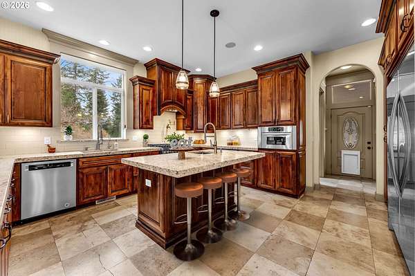 - Builtin Oven, Builtin Range, Builtin Refrigerator, Dishwasher, Disposal, Gas Appliances, Granite, Island, Microwave, Pantry, Pot Filler, Stainless Steel Appliance, Tile, Water Purifier