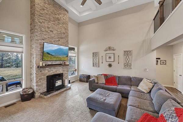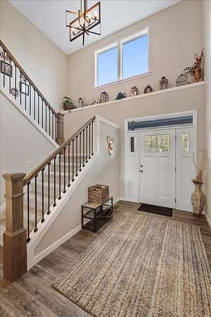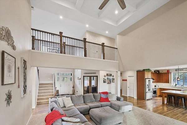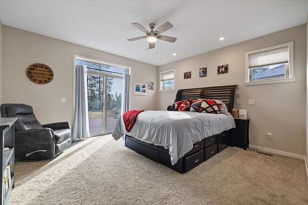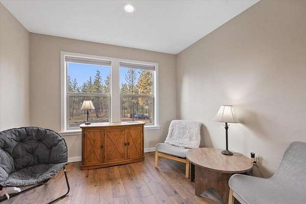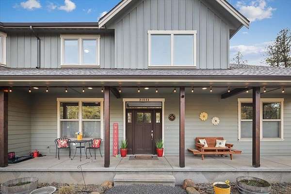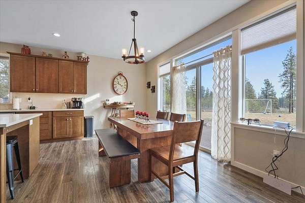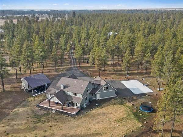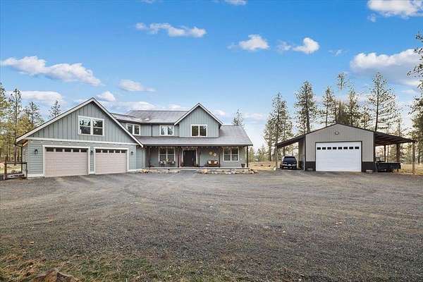 Stunning 4 bed/2.5 bath, 3,200 sq ft home set on 10 private gated acres with shop and room to roam. The expansive kitchen shines with stainless appliances, quartz counters, a walk-in pantry, and an inviting dining area. A dramatic floor-to-ceiling chimney with pellet stove anchors the open living space. Main floor primary suite offers true retreat living with a soaking tub, walk-in shower, dual sinks, a spacious walk-in closet and doors out to your back deck. A designated office and main floor laundry/mud room area add everyday ease. Upstairs, an open catwalk leads to three bedrooms, a full bath, and a generous bonus room above the 3 car garage. Enjoy outdoor living on the covered deck overlooking wide-open acreage, plus a concrete sports court for play. Bring all the toys-this 24' x 30' powered shop features two 12' lean-tos, RV clean out and a 30 amp outlet along with a 50 amp plug for your EV. Located in the sought-after Cheney School District, this property blends comfort, style, and acreage living.