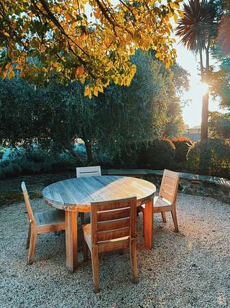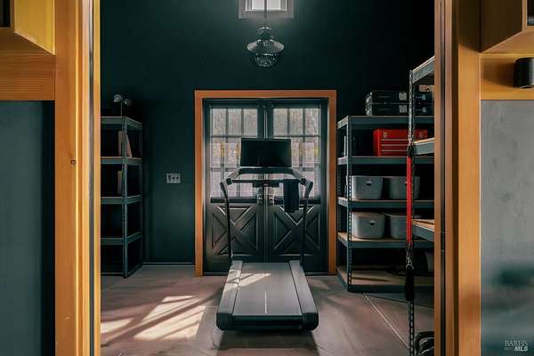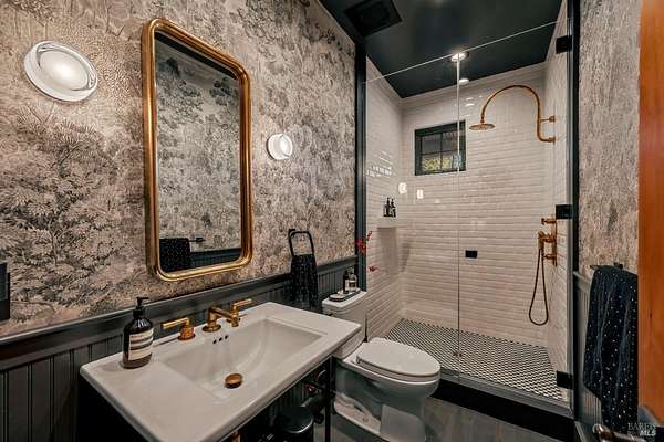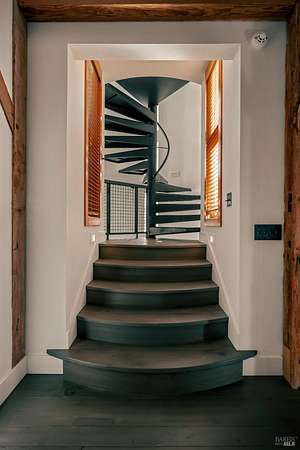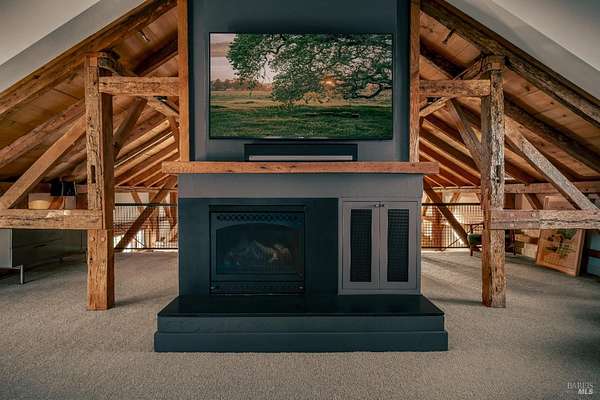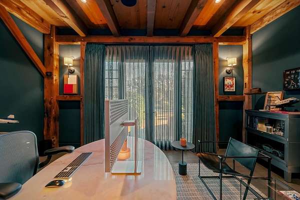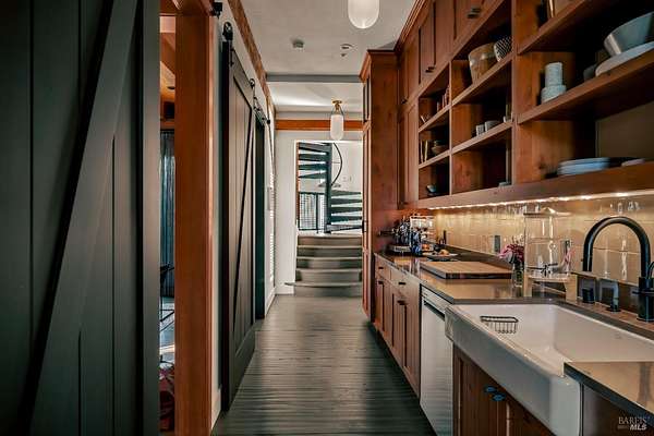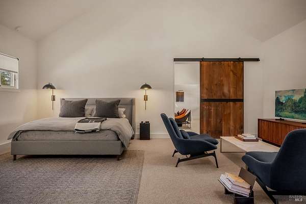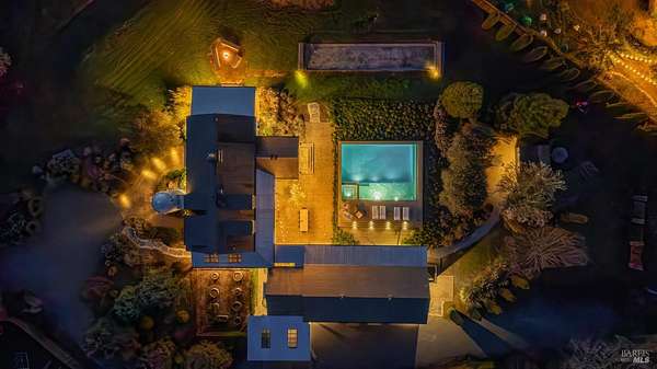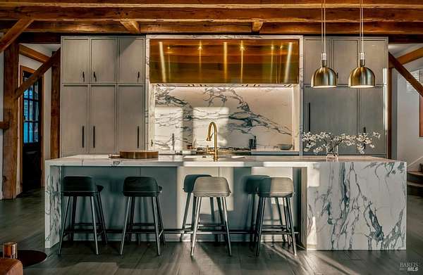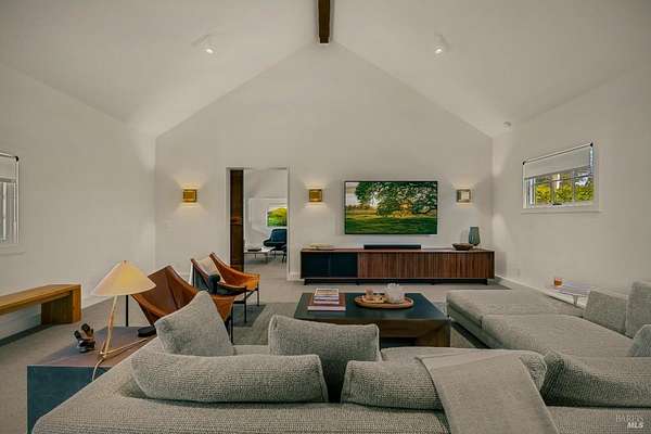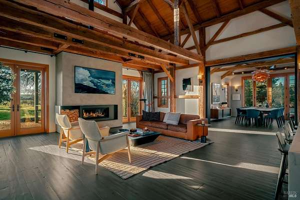 Dos Palmas is a thoughtfully restored historic barn reimagined for modern living in Sonoma. Set within an open meadow with clear sightlines to Mount Sonoma, the property offers privacy achieved through careful siting and landscape integration. The main living space retains its original rough-hewn, load-bearing barn frame, creating dramatic scale and architectural presence. Interior finishes pair marble with exposed structural wood, bespoke walnut millwork, deep-stained hardwood floors, and aged brass accents. A custom Corten steel fireplace anchors the great room, while a cylindrical silvered-steel stair tower serves as both circulation and architectural focal point. A cupola skylight crowns the integrated kitchen, dining, and living areas. Supporting spaces include a butler's prep kitchen, primary loft ensuite with sitting area and fireplace, main-level bedroom and bath (currently office/studio), and detached guest house with media lounge and private accommodations. Multiple French doors open to the fire pit, pool terrace, and custom pool positioned to capture evening light. The grounds feature a seasonal creek, olive and fruit trees, raised beds, bocce court, and sunset porch. Modern infrastructure includes high-bandwidth internet, property-wide Wi-Fi, integrated AV, Sonos, and solar. A rare alignment of architecture, land, and atmosphere - Dos Palmas offers a setting where pace softens and clarity returns.