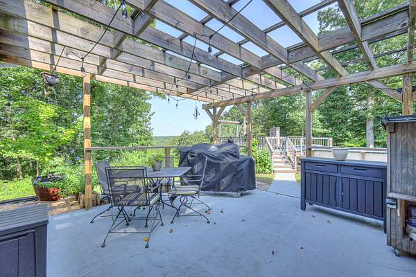 The den features a cozy pellet/wood-burning stove along with built-in storage and a handy drop zone for all the kids' gear. With an open floor plan, vaulted ceilings, and a breakfast bar that connects to the kitchen pass-through, entertaining feels effortless. From your kitchen window, watch wildlife stroll by or step out to enjoy the peace of your acreage.
