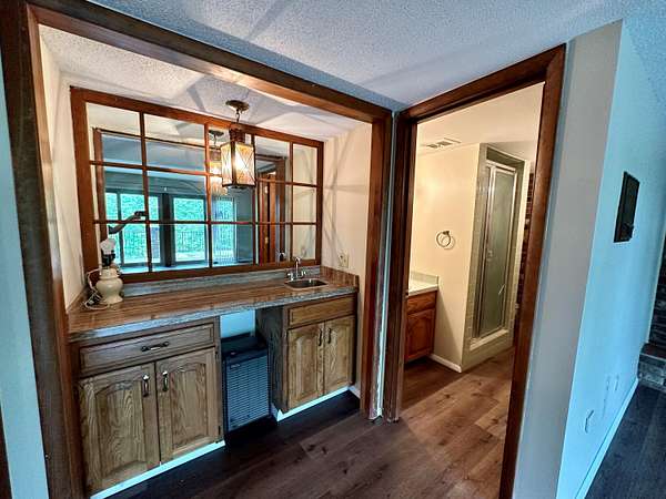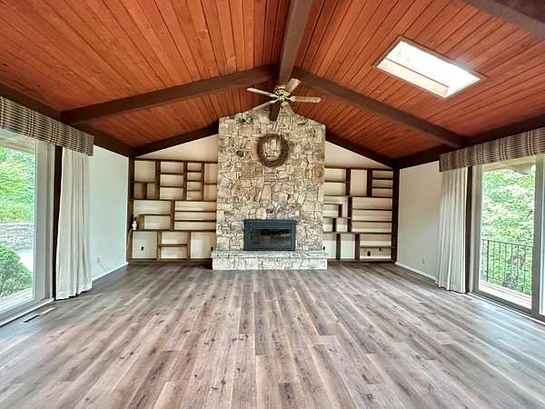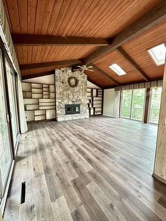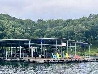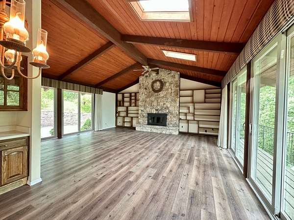 Beautifully UPDATED lakeview home in Shell Knob Estates with BOAT SLIP AVAILABLE for additional $. This 3 bedroom, 3 1/2 bath home sits on 1.6 acres, giving you the feel of seclusion while being conveniently located just minutes from town. The circle drive features a drive thru veranda large enough to accommodate 2 cars nestled between the home and attached storage building. Parking is not a problem with the additional oversized 2 car detached garage. The main level features: double door entry leading you into the spacious foyer, tongue and groove cathedral ceilings with wooden beams through-out; and an open living room, dining and kitchen area with an amazing fireplace surrounded by built-in shelving on each side. The master suite located on the main floor includes: sliding glass doors to the deck; a walk in closet; jetted tub; and separate shower area. All brand new sliding glass doors and full size windows fill the lakeview side of the home, both upstairs and down. The walkout basement has a family room large enough to accommodate an additional sleeping area, it also has a bar area and beautiful fireplace for relaxing or entertaining. All of this and brand new luxury vinyl plank flooring and paint throughout. This is a must see! Come take a look!