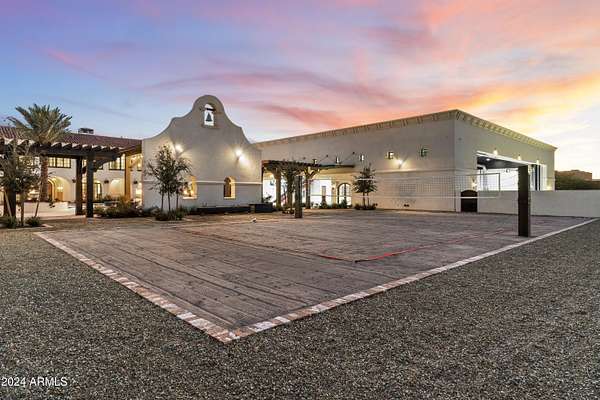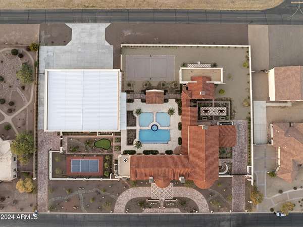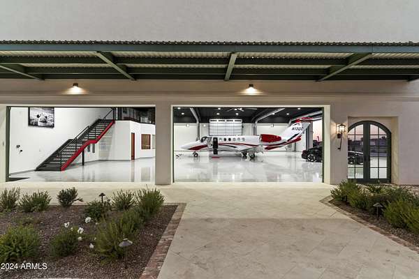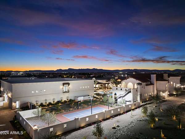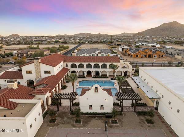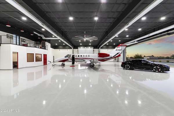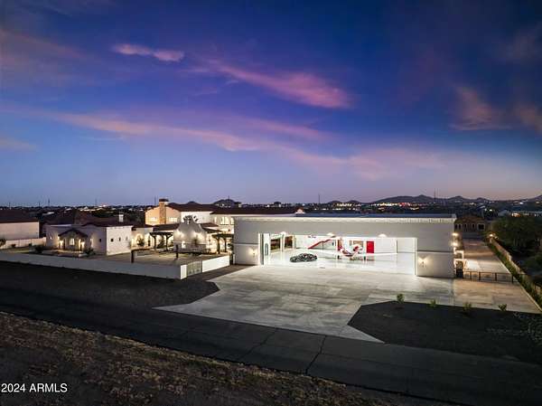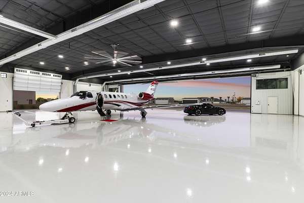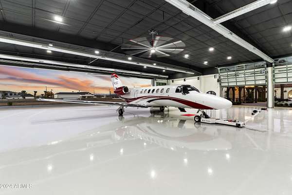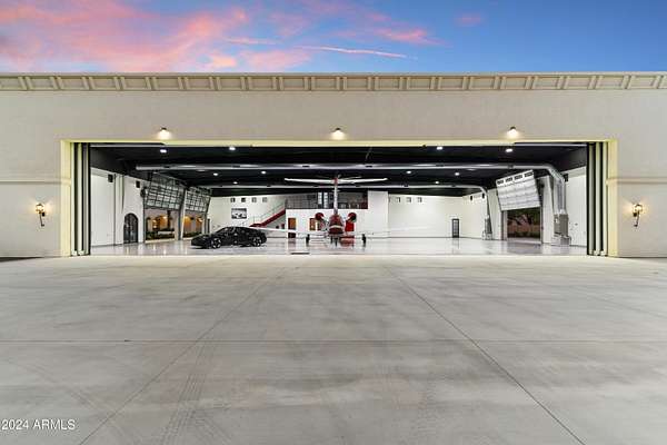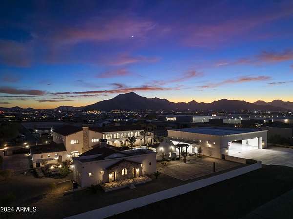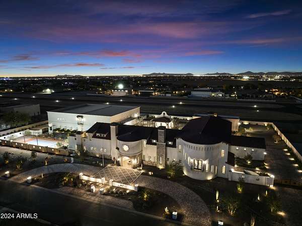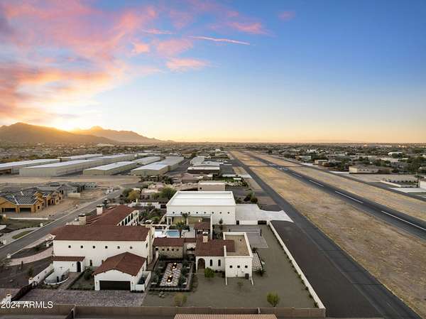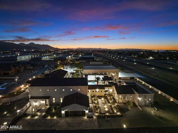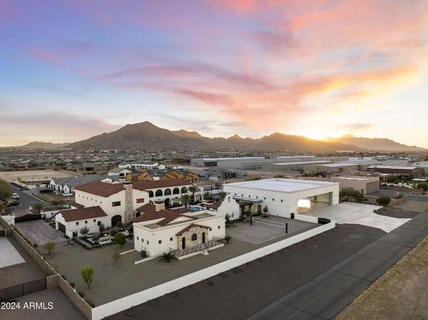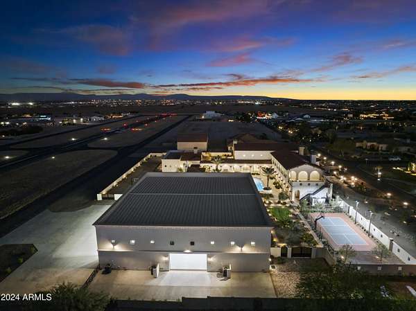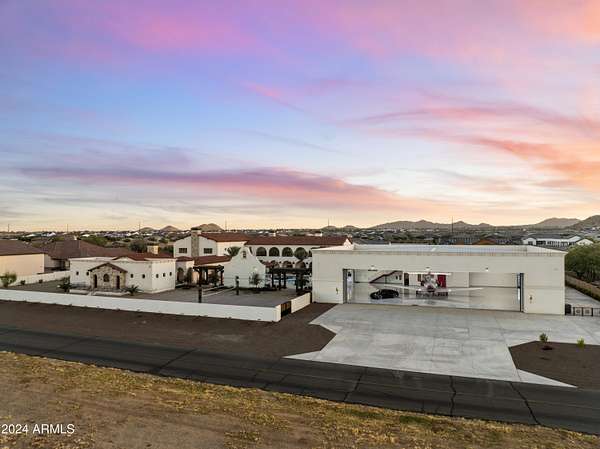 Introducing Mision Veintidos (Mission Twenty-two). This amazing Pegasus Airpark (5AZ3), Queen Creek, AZ home was inspired by classic Spanish style mission architecture. The unique mission style entrance to the home is through a breezeway gate which leads you to a stunning courtyard view of the estate. This estate of 32,000 sq ft of luxury living, with an incredible 26,000+ sq ft of conditioned space has 16'' thick walls for style and maximum efficiency. Perfectly situated on North South double lot, taking a massive 350' of taxiway, sits the main residence on three levels and includes all these features: A 10,000 sq ft steel construction Hangar with Full HVAC, Epoxy coated floor, ''Big Ass'' Fan, Pocket style main hangar doors with an 78'x17' clear opening. Flight office, Storage room, Downstairs bathroom, Interior stairs to mezzanine with bar, Upstairs bathroom, Balcony, Two motorized vertical opening 20 ft glass garage style doors facing the courtyard. " A massive courtyard featuring: 2,000 feet of covered breezeways, Multiple swimming pools with fountains and firepots, Covered outdoor full kitchen under a mission style bell tower, Lit Pickle ball/basketball sports court & Putting green, Sand Volleyball court. "The main house has a 5,000 sq ft Basement: bowling alley, 75 ft shooting range, Tiger Woods' (Full Swing Pro 2.0) Golf Simulator, Wine Cellar, Walk-in vault, Storage room, Bathroom, Interior and exterior stairs. " Next is a 2000+ sq ft detached Master Bedroom: Custom his and her walk-in closets, Separate bathrooms and linens, Large walk-in shower & separate tub, Incredible ceiling details with accent lighting, Multiple balconies, Bar, Fireplace, sliding doors. " Master Spanish Garden: with water and fire features. " General Design considerations: 16" double insulated walls which are quieter, more energy efficient and style correct as seen in the deep-set windows and doors, The extensive iron work is amazing, Custom railing with HH monogram, windows with iron details. " Don't miss these details: clear view elevator from basement to second story sized for wheelchair access. " Wired Cameras access from internet. " Automated lighting. " Security System " Hidden AV closet " Luxury full-service guest suites with spa like bathrooms, suites include laundry and bar in each " 2834 sq ft 2nd Story with Gym, spa and sauna, gym bathrooms & laundry. " Large outdoor balcony, firepit, incredible views of the Superstition and San Tan mountains " Balcony sliding windows overlooking the courtyard. " Firepole slide down from gym to first floor hidden door " Formal living room " 30' sliding glass doors with view of hangar " 28' ceiling with massive beams " Oversize castle style fireplace " Gourmet kitchen with Baking center " Sub Zero Wolf appliances, Easy access from vehicle to kitchen, Fully equipped Butler's Pantry. Dark and smokey (informal sitting room) " Floor level gas fireplace " Full bar " Bathroom " Large sliding window overlooking courtyard pool. Too many features to list.