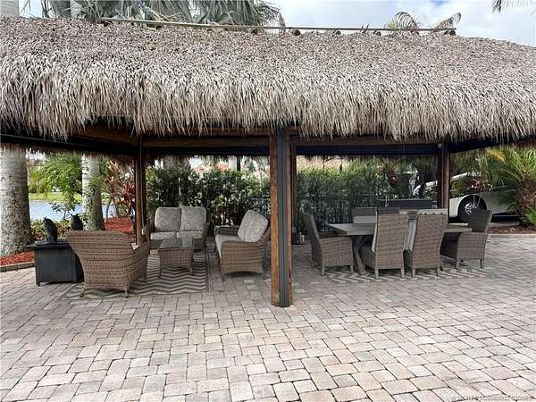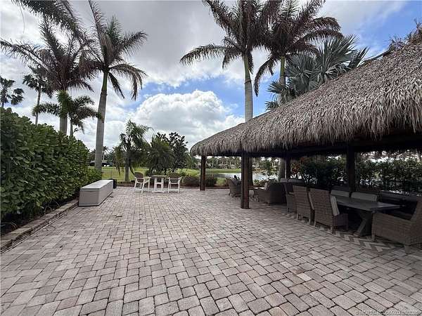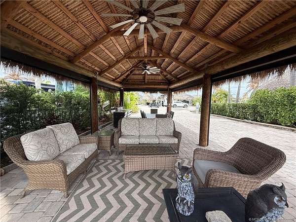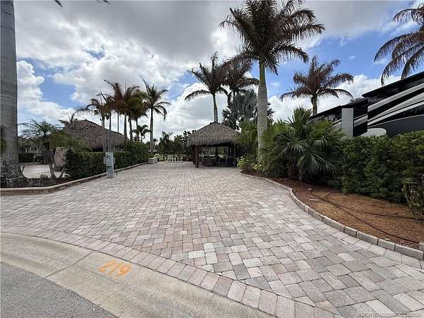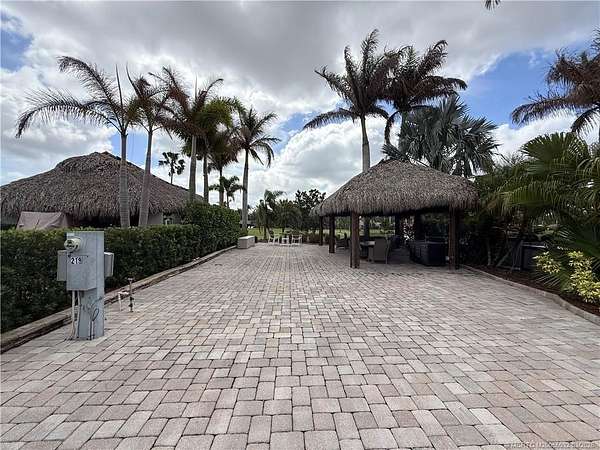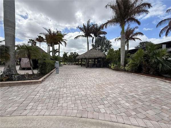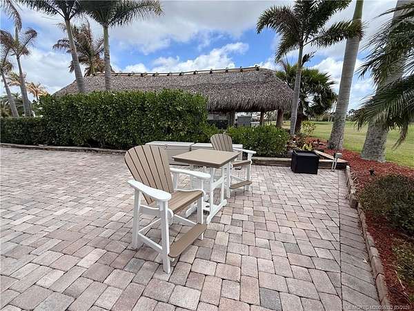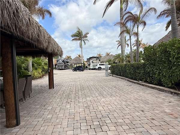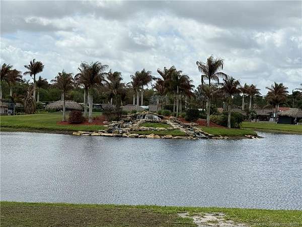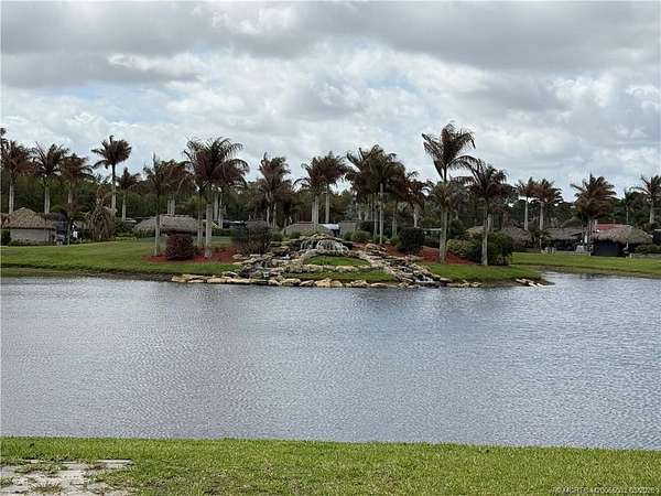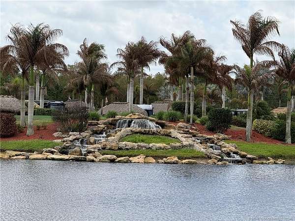 Exceptional oversized 2,749 sq. ft. pull-in lot offering breathtaking views of the golf course and a stunning double waterfall feature. This fully pavered property is designed for both comfort and entertaining, highlighted by a spacious tiki hut complete with a well-appointed modular outdoor kitchen. Ideally situated just moments from the main clubhouse and resort amenities-including pickleball, shuffleboard, bocce ball, and the main pool-this lot combines convenience with a serene setting. Mature, lush landscaping with majestic palms provides both privacy and a true tropical ambiance. Enjoy peaceful mornings with spectacular sunrises and frequent visits from local wildlife, creating a relaxing, nature-inspired retreat. With a strong rental history already established, this property presents an excellent opportunity for both personal enjoyment and income potential.