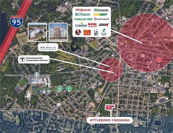 This opportunity to purchase Attleboro Crossing Plaza at 219 S Main St is a unique owner-user or investment offering in Attleboro, Massachusetts. This 100,000+ sqft versatile property offers 11 total retail spaces with 31,000sq' available to an owner-user or for lease. The property presents significant potential for owner/users seeking a move-in-ready facility or investors pursuing value-add/repositioning strategies with two permitted 5000sq' pad sites still available, akin to the third, occupied by Dunkin Donuts. Strategically located in a high-traffic area right off of I95 and just minutes from downtown Attleboro, the property is sat just beside the Attleboro T-Station to Boston on the Providence/Stoughton Line, as well as all the high-end residences at 1 Wall Street . Situated on an 11.7-acre site, Attleboro Crossing features several loading docks and drive-in doors, making it well-suited for a variety of retail uses. National and regional brands anchor the plaza with Family Dollar, Seabra Foods, Dunkin Donuts, plus Dialysis Center of RI and MA. Illuminated pylon signage, ample parking, video surveillance cameras and multiple points of ingress/egress to the plaza make Attleboro Crossing an attractive asset to a broad spectrum of potential ownership. High power capacity, natural gas and fiber optic infrastructure here may also make this property attractive for modular data center positioning.