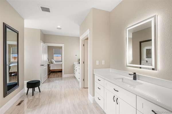 The luxurious master suite boasts a double sink vanity and a spacious walk-in closet, creating a true private retreat. A second master suite with its own full bathroom offers incredible flexibility for multigenerational living or guests. Two additional bedrooms are thoughtfully appointed with private sinks and a convenient shared bath, giving everyone their own space. All bedrooms boast spacious walk-in closets. Thoughtful details that elevate everyday living.