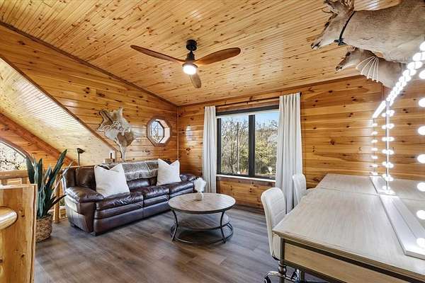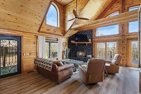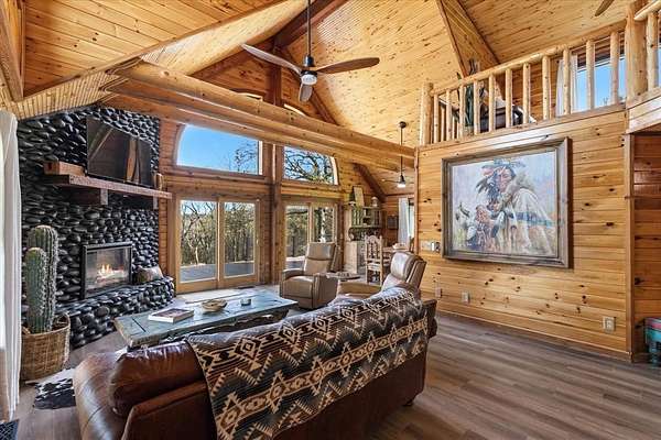 The property features two custom log cabins designed with rustic charm and modern comfort. Each cabin offers a warm, cozy feel with spacious open-concept living, vaulted ceilings, wood finishes, and inviting interiors perfect for relaxing or hosting guests. The first cabin includes approximately 1,988 sq ft with 3 bedrooms and 2 bathrooms, while the second offers 2,020 sq ft with a similar layout.