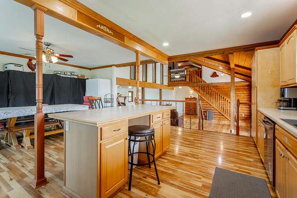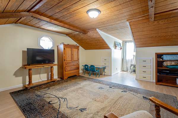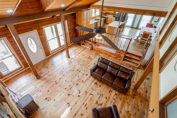 As you approach, you're greeted by a classic covered front porch--ideal for enjoying quiet mornings, scenic sunsets, and the sounds of nature. Inside, the main level features an open-concept living area with hardwood and tile flooring, an eat-in kitchen with dining space, two bedrooms, and a full bathroom. A large bonus room upstairs adds extra flexibility for a home office, guest space, or entertainment area.
