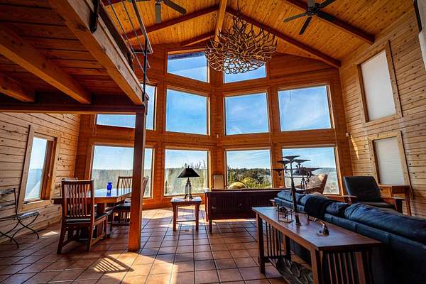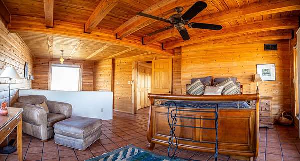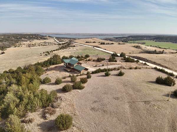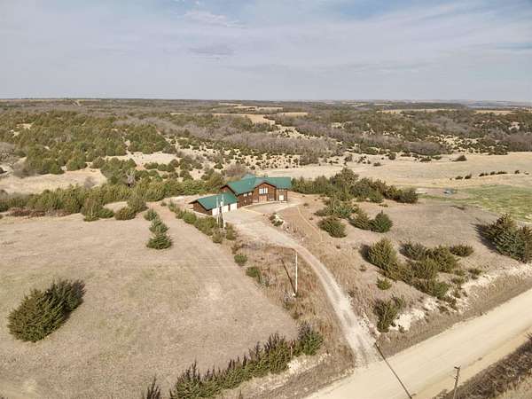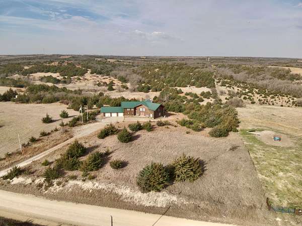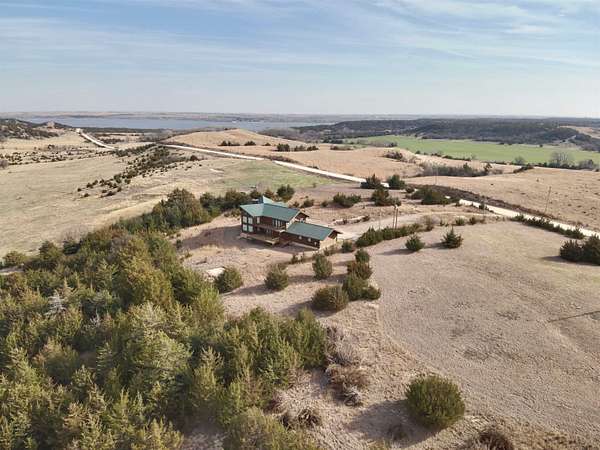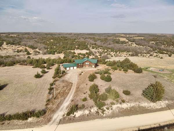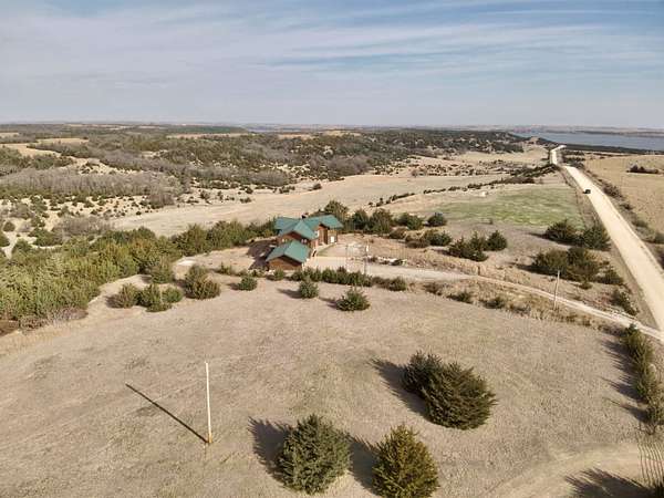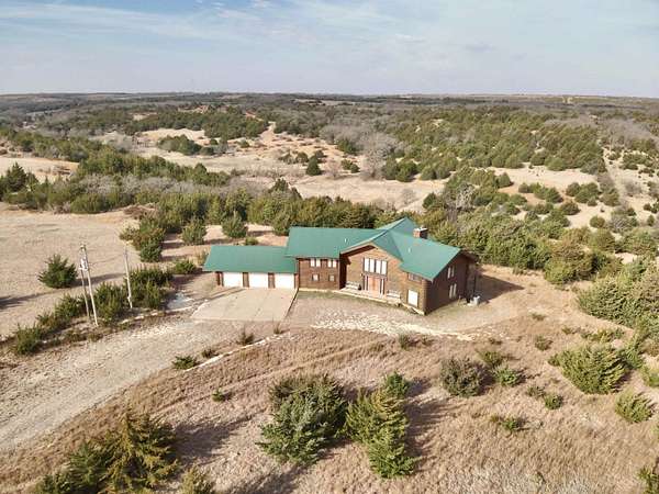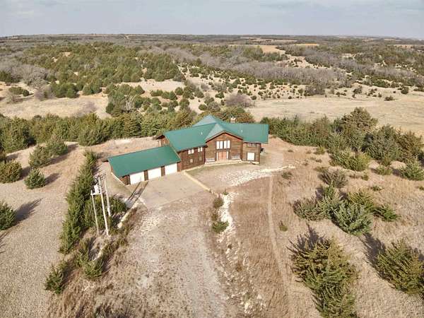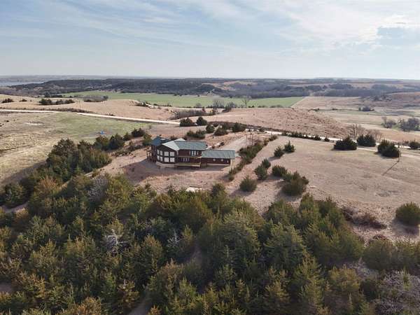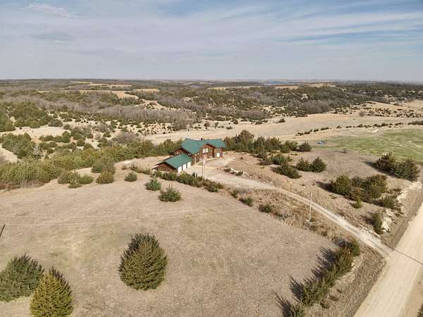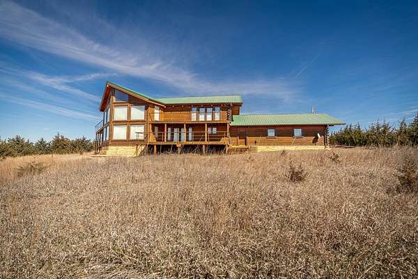 This custom-built, 4-bedroom, 3.5-bath log cabin offers a perfect blend of rustic elegance and modern comfort, featuring an expansive open floor plan and custom finishes throughout. Designed for entertaining and connecting with nature, the home boasts a towering great room with floor-to-ceiling windows along the back, bathing the interior in natural light and providing panoramic views. Sits close to Lovewell Lake with amazing views throughout the day. Gorgeous sunrises and sunsets. This peaceful country spot is the perfect getaway home away from the spotlight for private quiet peaceful living. With a private drive entrance, features attached 3 car garage, main floor laundry room/mud room, wired in security system, 2 hot water heaters, 2 HVAC systems for each side of the home. This custom log cabin would be a perfect retirement home or family home. Great for entertaining guests or family gatherings. A one-of-a-kind home with only one homeowner in its history since being built! Come make this dream home yours today!!