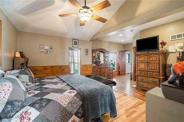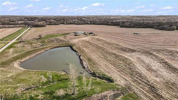 Welcome to your dream country escape with 160 acres of beautiful farmland featuring a peaceful pond, a spacious shop, and a custom wooden home with a metal roof full of rustic charm. Inside you will find an open concept layout with vaulted ceilings, a custom wood ceiling design, and large windows that fill the space with natural light. The living area centers around an old-fashioned fireplace that adds warmth and character. The kitchen includes stainless steel appliances, a large bar area, and charming wooden countertops that are perfect for everyday use or gathering with friends. The foyer offers a convenient space for guests to drop their things along with a nearby bathroom and laundry area. The master bedroom features plenty of windows, two entry doors, and a large walk-in closet. Upstairs there is a private bedroom with its own walk-in closet. The unfinished basement includes a full bathroom and two storage rooms giving you the freedom to create a space that fits your needs whether it becomes a workshop, extra living space, or something entirely your own. This property is full of opportunity with 160 acres of versatile land ready for farming, recreation, or simply enjoying peaceful country living.