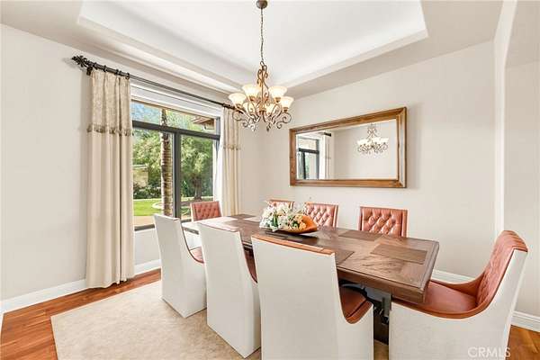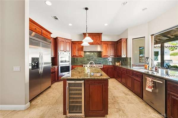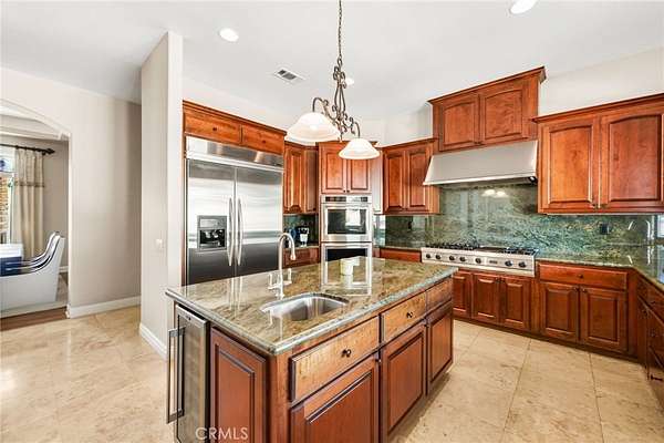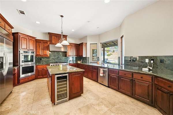Inside, natural light pours through expansive windows, showcasing 10' ceilings, 8' solid mahogany doors, and luxurious 18" travertine flooring. The chef's kitchen is designed for both everyday living and entertaining, featuring rich cherry cabinetry, a spacious island with prep sink, wine refrigerator, and premium appliances, including a Viking cooktop, KitchenAid double convection ovens, built-in refrigerator, and dishwasher. Formal living and dining rooms add a touch of sophistication with engineered walnut wood floors and coffered ceilings accented by ambient lighting.
