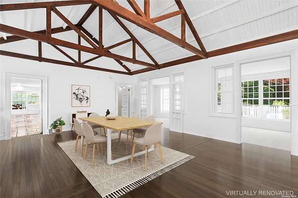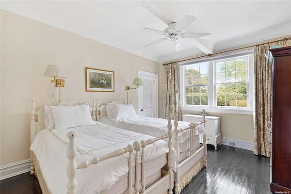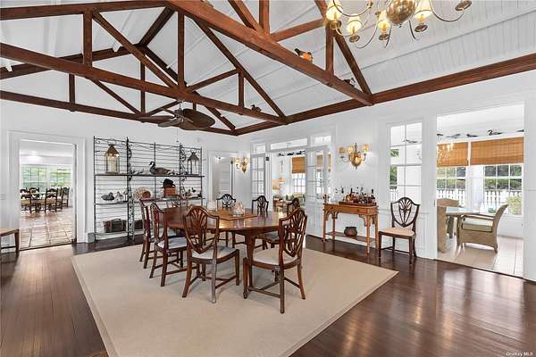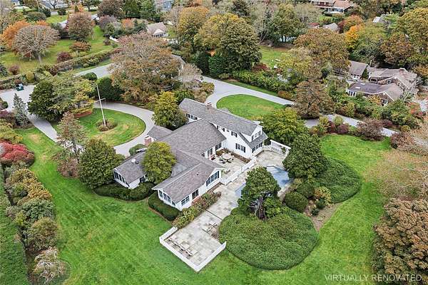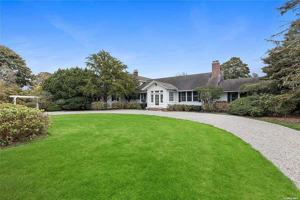 On over two acres, this Village estate is in close proximity to both vibrant Main Street and Dune Road's ocean beaches. Enter the gated estate through a circular drive off Bayfield Lane to the classic Dutch-doored front foyer. There is also a gated service entrance off Stevens Lane. A perfect weekend get-away or a year-round residence, this home boasts an expansive great room with soaring ceilings, exposed beams, and a gas fireplace. The handsome study, with wood-burning fireplace, and sunny all-seasons enclosed porch offer rooms for entertainment and relaxation. The eat-in kitchen has a large center island, ample pantry space, a classic Garland range, and an adjacent mudroom/ laundry room with a separate entrance. A generous primary suite, two additional bedrooms with a shared bath, and a powder room complete the first floor. The second story provides an additional en-suite, along with two more bedrooms with a shared bath. The sprawling hedged property includes mature landscaping, heated gunite pool, and tennis court. Two-lot subdivision is also in progress.