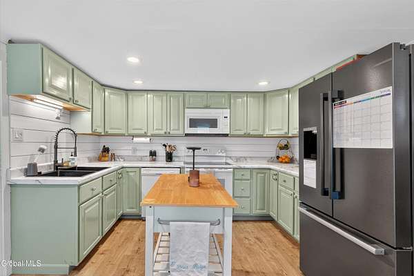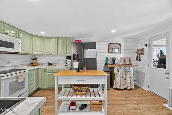 - Chair Rail, Crown Molding, Eat-In Kitchen, Solid Surface Counters, Wall Paneling