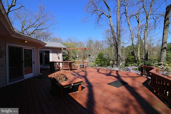 Tucked away in the peaceful Medford Farms community of Tabernacle, this truly one-of-a-kind ranch offers privacy, space, and character on 1.8 acres. From the moment you arrive, you are greeted by an expansive deck that wraps around half the home and is highlighted by mature landscaping. Step through the front door into a home that feels bright and warm. Rich hardwood floors and a neutral palette flow throughout the main living spaces, creating a timeless backdrop for everyday living and entertaining. The living room is a standout, featuring vaulted ceilings, skylights, oversized windows, and a cozy wood-burning stove. The dining room opens seamlessly to the kitchen, making entertaining a breeze! The eat-in kitchen offers abundant cabinetry, granite countertops, custom tile backsplash, stainless steel appliances, double ovens, a large pantry, and an impressive center island. Both the kitchen and dining room lead directly to a spacious wraparound deck, perfect for indoor-outdoor entertaining or quiet mornings overlooking the property. The home offers three generously sized bedrooms, including a private primary suite with vaulted ceilings, skylights, a walk-in closet, and an en-suite bath. Sliding doors provide direct access to the rear deck, adding to the retreat-like feel. Two additional bedrooms share a well-appointed hall bath, and a dedicated office provides flexible space for work or hobbies. Downstairs, a full basement offers endless potential for storage, recreation, or future expansion. Adding to the property's uniqueness is an impressive 2,500-square-foot, two-story workshop featuring five barn doors, electrical and plumbing-ideal for creatives, car enthusiasts, contractors, or anyone needing some serious space! This home also offers a brand new boiler (2026) and easy access to major roadways like 206 and Route 70! With all this home has to offer- this is a property you need to experience in person to fully appreciate!