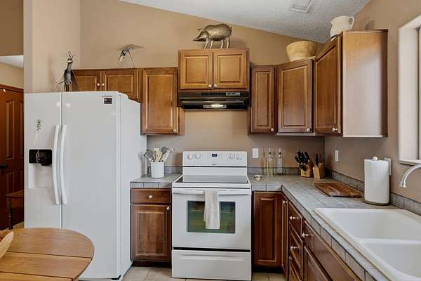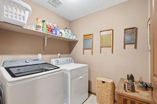 Well maintained, light, bright, open floor plan with Cathedral Ceilings in the main Living, Dining and Kitchen areas. New roof at the beginning of 2026. New Water Heater Jan. 2024. Spacious Kitchen with large pantry. Separate Primary Suite with two walk-in closets and full bathroom on one side of home. Full Bathroom and Two Bedrooms, one with walk-in closet, on the other side of the home. Wood Burning, corner fireplace in the Living Room . Covered patios on the front and back of home. Finished two car garage with tons of custom, built-in cabinets. Newer storage shed. Refrigerated Air and Forced Air Heat. Mostly level 2.08 acre lot.