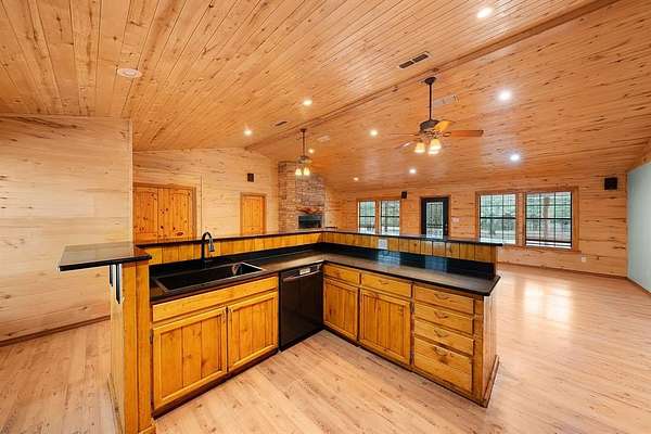 Take a look at this wooded 8.4 acres with a workshop and 3 bedroom, 2 bathroom house! A tree-lined drive brings you past a pipe-fenced entrance. You'll notice a front porch that is perfect for soaking under the shade of trees. Inside the vaulted living room, a stone fireplace with seating draws your attention in a cabin-flair interior. An open floor plan allows you to cook while entertaining guests or family. An extra large island with breakfast bar seating, granite countertops, stainless steel appliances, and access to the back porch compliment the kitchen. With a split bedroom layout, the primary ensuite includes a walk-in shower and garden jacuzzi tub. Additional bonuses are a new HVAC in 2022, new screws in roof in 2024, new septic pump in 2024, and recessed lights. A back porch provides a spot for grilling or watching the wildlife. The 30' x 40' workshop comes with concrete floors, 2 roll up doors, 10' x 10' roll-up door at the front and 9' x 8' roll-up door on the side, 1 walk-thru door, and a 10' x 40' covered lean-to area for equipment or vehicles. A shed could be used for a chicken coop, other farm animals or for more equipment storage. Make this wooded retreat your exclusive hideaway!