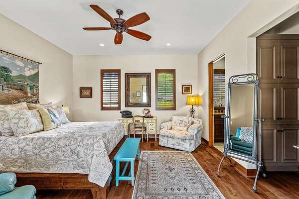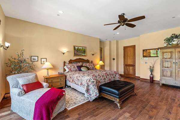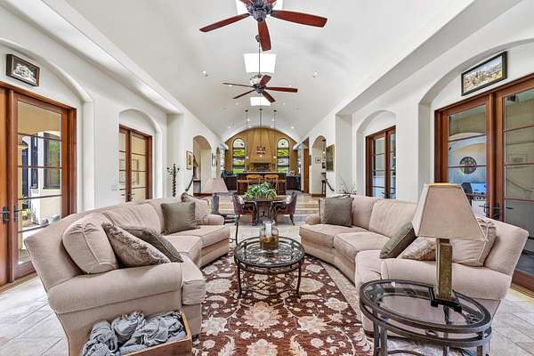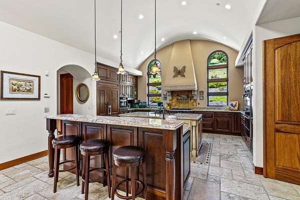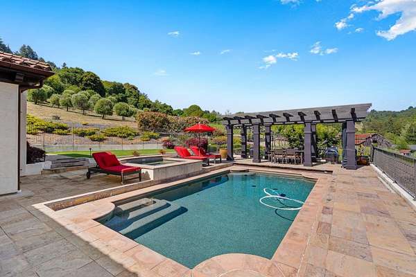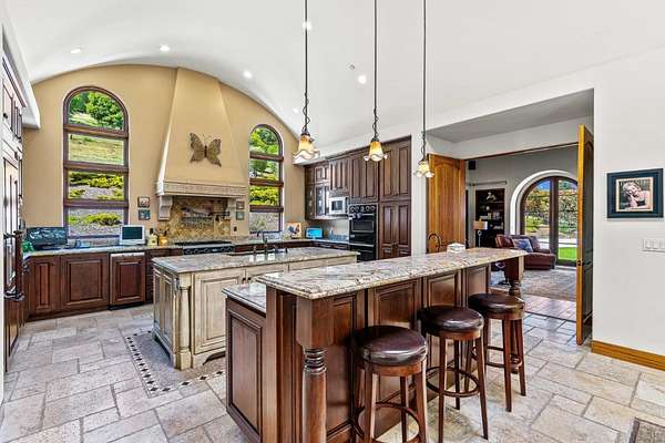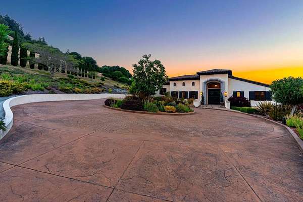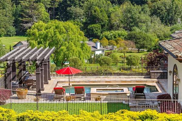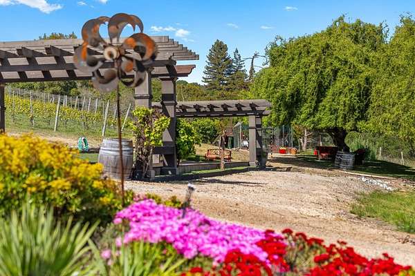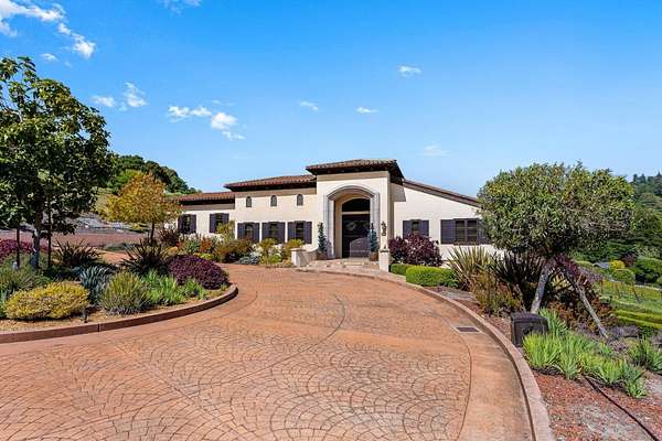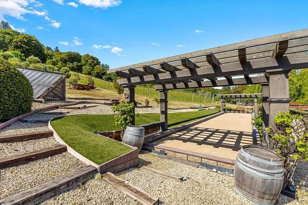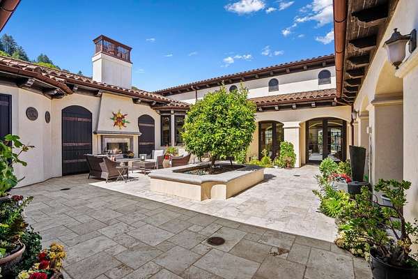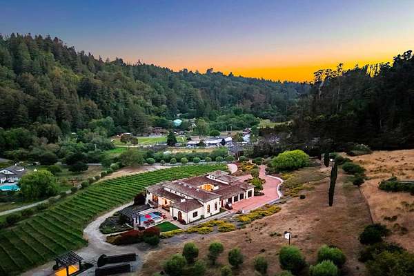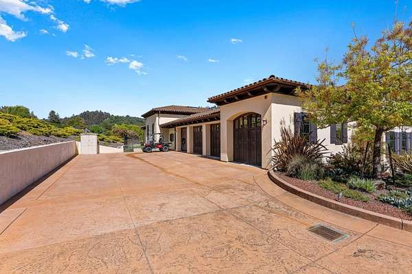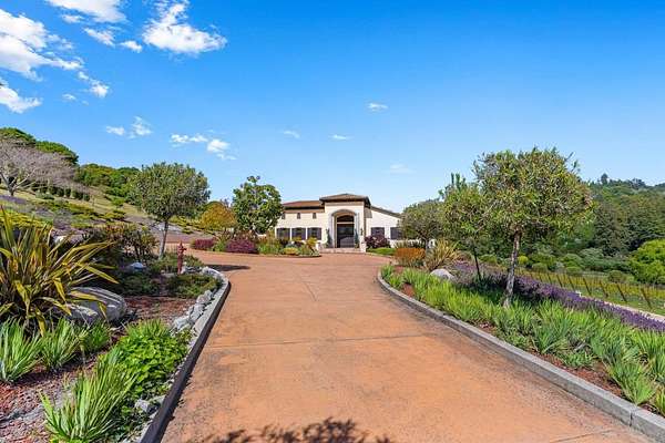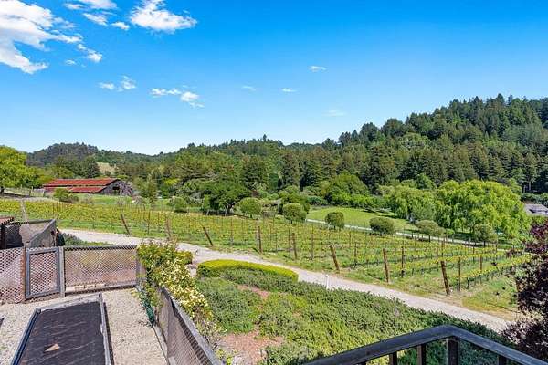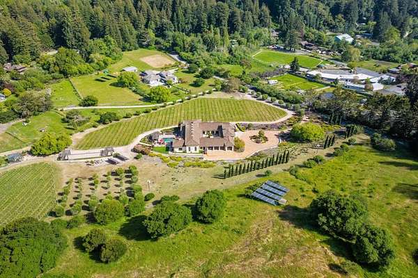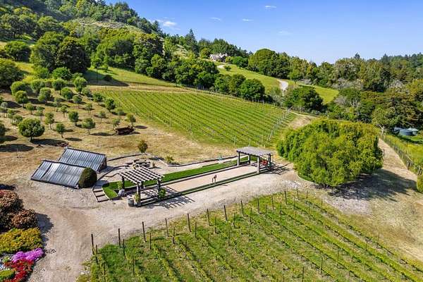 Nestled in a meadow & surrounded by over 21 acres of natural beauty, this magnificent gated Tuscan-inspired estate includes 1.5 acres of Pinot Noir grapes, offering a unique opportunity to own a private vineyard just 10 minutes from both Santa Cruz & Hwy 17 for easy access to Silicon Valley. At the heart of the single-level home lies a charming gated interior courtyard adorned with fruit trees, an outdoor fireplace, & a welcoming guest suite. The homes open layout, with abundant windows & French doors, invites seamless indoor-outdoor living. The spacious great room flows effortlessly into a chefs kitchen with other spaces including a formal dining room, family room & a pass-through bar opening to a built-in BBQ center beside the resort-style pool. The expansive grounds offer a bocce court, greenhouse, raised garden beds, a custom playground, a two-story treehouse with suspension bridge, pool & spa with designated bath, & multiple outdoor dining & lounge spaces. For automotive enthusiasts, an attached 4-car garage pairs with a separate 2-story barn/workshop featuring a car lift and room to accommodate up to 7 additional vehicles. The barn also includes a studio apartment & sits on a gently elevated section of the property, offering panoramic views & additional usable land.