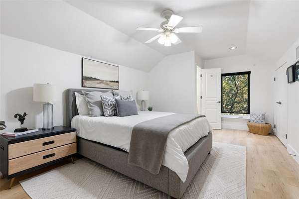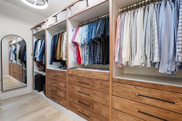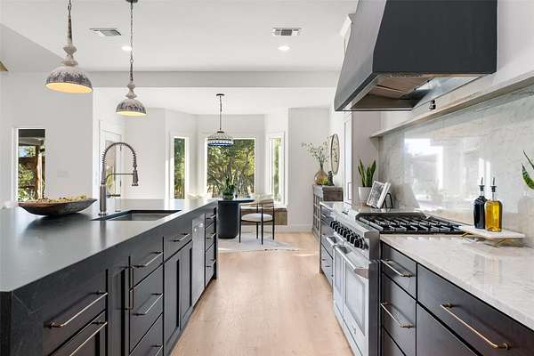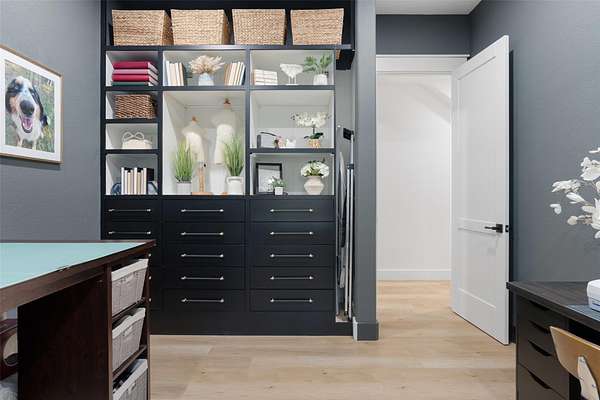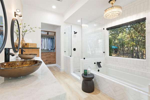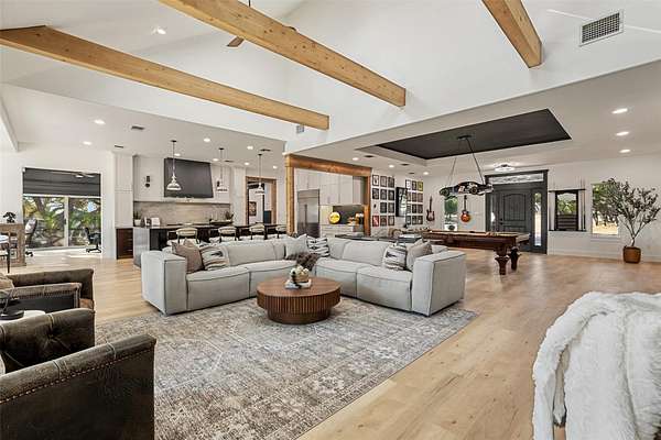 - Beamed Ceilings, Breakfast Bar, Built-In Features, Ceiling Fan(s), Ceiling-High, Ceiling-Vaulted, Crown Molding, Double Vanity, Eat-In Kitchen, Interior Steps, Kitchen Island, Multiple Dining Areas, Open Floorplan, Primary Bedroom On Main, Quartz Counters, Recessed Lighting, Soaking Tub, Walk-In Closet(s)