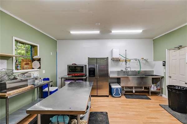 Turnkey Mini-Farm with Commercial Kitchen, Orchard, and Workshop on 8 stunning ACRES! Discover the perfect blend of peaceful country living and small farm potential just 6 miles south of I-20 and convenient to Carrollton & the University of West Georgia. This beautifully maintained ranch-style home sits on 8 fully usable acres with established infrastructure for your dream agricultural or artisan food business. Step inside the charming 3-bedroom, 2-bath brick ranch featuring an open floor plan, heart pine flooring throughout, new energy-efficient windows, a rocking chair front porch, and a three-season sunroom overlooking the back pasture. The split-bedroom layout ensures privacy, and the custom kitchen with full brick fireplace opens to a spacious family room perfect for gatherings. Recent upgrades include fresh paint inside and out, plus new water heaters for both the home and commercial facilities. For the aspiring farmer or food entrepreneur, this property delivers: A 30'x60' workshop with 600 sq ft commercial kitchen, complete with its bathroom, 1000-gallon septic, and water heater-ready to license with the Georgia Department of Agriculture for your baking, canning, or catering venture. A 20'x60' hoophouse, ideal for year-round growing, paired with fertile in-ground beds ready for immediate planting. A 10'x20' metal utility building with a walk-in cooler, ideal for washing, packing, and storing fresh produce. A mature orchard with apple, peach, Asian pear, and plum trees, plus over 25 blueberry bushes, blackberries, currants, grapes, muscadines, and figs-a pick-your-own operation waiting to happen! Expansive fenced pastures for future livestock, with deer and wild turkey sightings as a bonus. Whether you're looking for a serene homestead, a sustainable lifestyle, or a ready-to-go base for your farm-to-table business, this property is in top condition-house, shop, and land. All that's missing is your vision. Call today to schedule a showing of this amazing Mini Farm just minutes from Carrollton, Temple & Villa Rica!