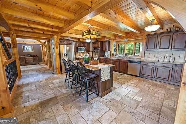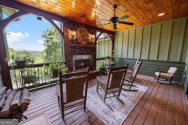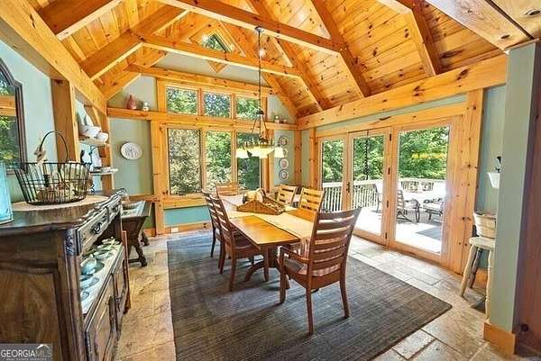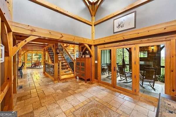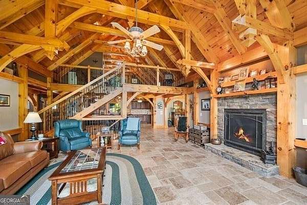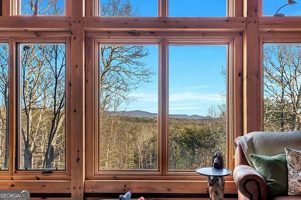 This custom Post & Beam home begins with a bright, three-story foyer with one of a kind views sitting on 3 acres. This opens into the great room, where high ceilings, exposed beams, and a striking stone fireplace anchor the space. The chef's kitchen is thoughtfully laid out with ample counter space, custom cabinetry, and an easy flow into the dining area. The screened porch, complete with its own fireplace, is made for enjoying the outdoors in every season. The primary suite offers privacy, generous space, and peaceful views, while a dedicated home office provides a comfortable place to work or create. Upstairs, a full apartment with an en-suite bath and kitchen adds incredible flexibility-deal for guests, extended stays, or a private retreat of its own. The finished lower level feels like a personal getaway, featuring an in-law suite, home theater, gym, sauna, and a reinforced cement safe room. This custom mountain home is truly like no other- make it your own today! Additional 6+ acres for purchase