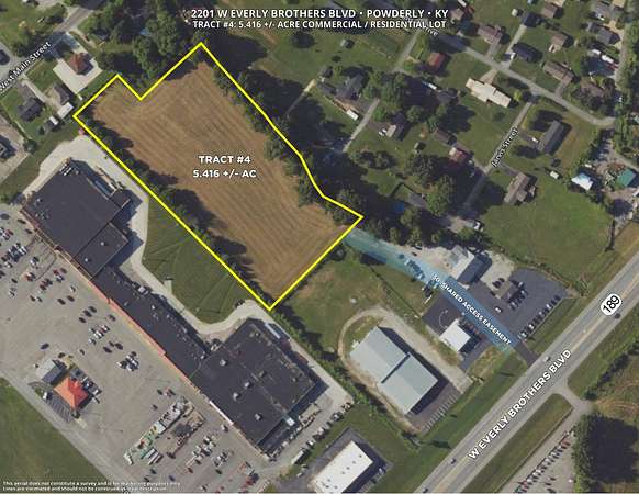 Online Auction!!! Investment / Business Opportunity. Selling in 4 Tracts. This listing is for Tract #4. 5.416 +/- acre commercial / residential lot behind Kroger & Bomgaars on the bypass in Powderly. Multiple residential or commercial development possibilities. Located near medical centers/clinics, shopping, dining, dealerships, Muhlenberg Co Ag Center and more! Open house on Thursday, April 16 from 5 - 7 PM. Bidding opens Monday, April 27th at 10:00 AM and closes Tuesday, April 28th at 2:00 PM. Call today for more information or for information on registering to bid. All bidders must be at least 18 years of age and must be registered online 24 hours prior to start of auction unless otherwise approved by auctioneer. A 7% buyer's premium is added to the high bid to determine final sale price of real estate. A 10% down payment deposit is due by 3:00 PM on Wednesday, April 29th, 2026. Real estate is being sold as-is, where-is with all faults. Closing to be on or before May 28th, 2026.