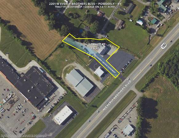 Online Auction!!! Investment / Business Opportunity. Selling in 4 Tracts. This listing is for Tract #1. Body shop / garage on 1.6 +/- acres. Shop features 3,696 +/- square feet with 2 bathrooms, a lobby, multiple rooms for offices and storage, a 36'8 x 46'7 garage, a 24'10 x 23'6 garage and 2 attached carports. Located near medical centers/clinics, shopping, dining, dealerships, Muhlenberg Co Ag Center and more! Open house on Thursday, April 16 from 5 - 7 PM. Open house on Thursday, April 16, 5 PM - 7 PM. Bidding opens Monday, April 27th at 10:00 AM and closes Tuesday, April 28th at 2:00 PM. Call today for more information or for information on registering to bid. All bidders must be at least 18 years of age and must be registered online 24 hours prior to start of auction unless otherwise approved by auctioneer. A 7% buyer's premium is added to the high bid to determine final sale price of real estate. A 10% down payment deposit is due by 3:00 PM on Wednesday, April 29th, 2026. Real estate is being sold as-is, where-is with all faults. Closing to be on or before May 28th, 2026.