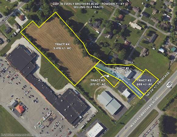Online Auction!!! Investment / Business Opportunity. Selling in 4 Tracts. This listing is for Tract #2. .669 +/- acre blacktopped commercial lot. Multiple possibilities for commercial development. 197 +/- feet of road frontage along W Everly Brothers Blvd. Located near medical centers/clinics, shopping, dining, dealerships, Muhlenberg Co Ag Center and more! Open house on Thursday, April 16 from 5 - 7 PM. Bidding opens Monday, April 27th at 10:00 AM and closes Tuesday, April 28th at 2:00 PM. Call today for more information or for information on registering to bid. All bidders must be at least 18 years of age and must be registered online 24 hours prior to start of auction unless otherwise approved by auctioneer. A 7% buyer's premium is added to the high bid to determine final sale price of real estate. A 10% down payment deposit is due by 3:00 PM on Wednesday, April 29th, 2026. Real estate is being sold as-is, where-is with all faults. Closing to be on or before May 28th, 2026.