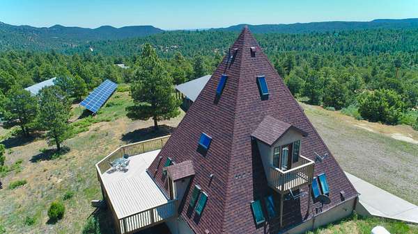 Discover a rare opportunity to own a self-sufficient sanctuary that blends sustainability, modern comfort, and rugged resilience. Situated in a gated community with panoramic views, this one-of-a-kind compound features a striking fully furnished 4-story pyramid-style home, versatile barn, 20 X 60 greenhouse, powerful back-up solar infrastructure, and a hidden underground bunker--all designed for long-term living and energy independence. The unique layout offers endless possibilities on each level to make it your own. The Home has 2 Bedrooms (with an additional non-conforming Bedroom/Game room) 3 Bathrooms and multiple bonus areas. Each room has been thoughtfully furnished and decorated creating a luxurious yet welcoming energy. Whether you're looking for a resilient and spacious family retreat, a sustainable property complete with high-tech infrastructure and security features, this property delivers unmatched peace of mind and potential. (See Supplement for Additional Information) The Pyramid Home--A true architectural marvel, this 46-foot-tall 4-story home is engineered for strength and energy efficiency offering, A sleeping loft situated at the golden ratio point (1/3 from the peak) Hydronic baseboard heating for even, efficient warmth, Updated kitchen with New Appliance, surround sound, meditation room with soaring ceilings, and an expansive bonus room, Double-insulated exterior walls and reduced window sizes for optimal climate control, Large stamped-concrete deck and backyard patio with awe-inspiring views, New 126 BTU power vent boiler, 40-gallon water heater, pressure tank (installed 2023), Internet and satellite infrastructure already in place, Provisions for solar expansion and emergency generator integration.