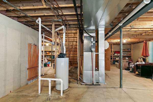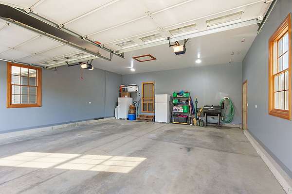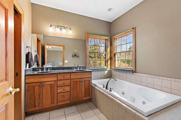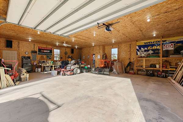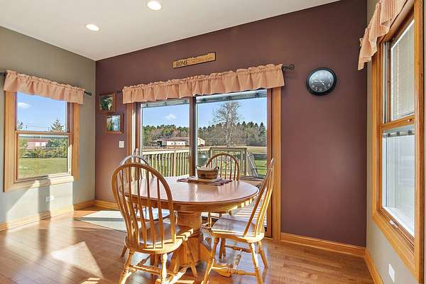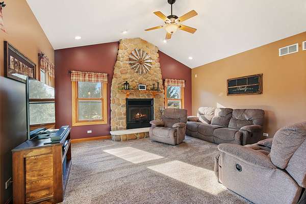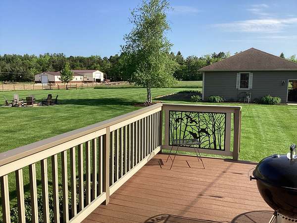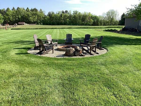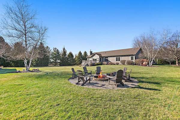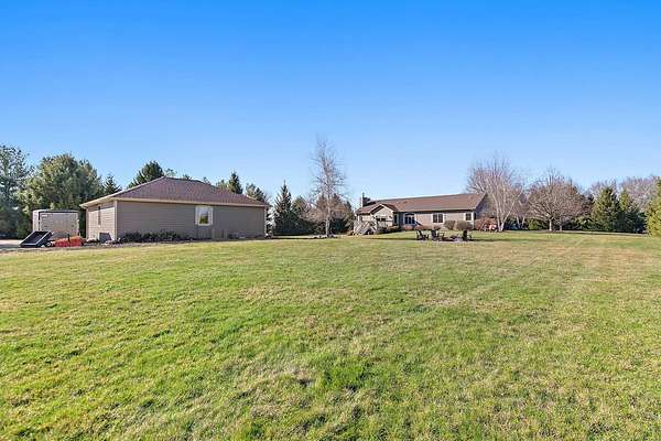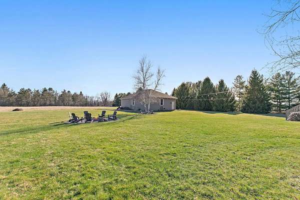Discover serene country living in this charming 3-bedroom, 2.5-bathroom ranch home, perfectly situated on 5 acres. Enjoy the best of both worlds with 2 acres currently leased for agriculture, providing the benefit of reduced property taxes. Step inside to find beautiful hardwood floors. The heart of the home is a gorgeous kitchen, designed for both everyday living and entertaining, featuring a double wall oven, a convenient breakfast bar, and a large double wide pantry. From the kitchen, step out onto a composite deck with custom iron railings, offering a perfect spot for outdoor enjoyment. Gather around the cozy stone, wood-burning fireplace in the family room, ideally located just off the kitchen. A half bath is conveniently situated just inside the hallway from the garage, and adjacent to the mudroom, which also provides access to a spacious laundry room complete with ample storage and a utility sink. A separate formal dining room adds to the home's functional layout. The master bedroom is a true retreat, boasting an en-suite bathroom with a separate tub and shower for ultimate relaxation. The expansive garden basement is a blank canvas, ready for your personalized touch. It features 9-foot ceilings, rough-ins for a full bathroom, a poured foundation for a future fireplace, and rough-ins for radiant floor heating, offering endless possibilities for additional living space. Rounding out this exceptional property is a versatile outbuilding, already plumbed with a rough-in for floor heat, providing extra space for hobbies, storage, or a workshop. This home offers comfort, convenience, and country charm.