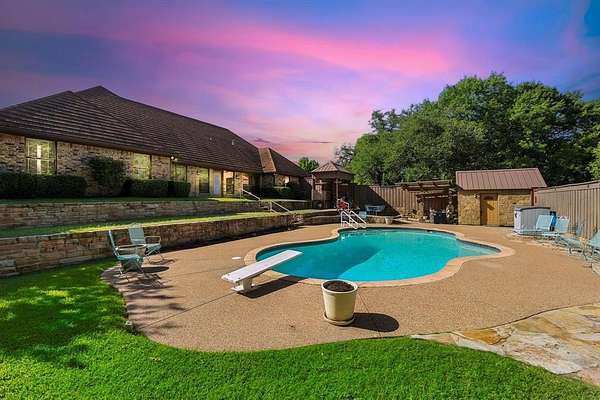 CAN YOU SAY INSTANT EQUITY! RECENTLY Appraised at 675k A truly unique Weatherford estate that blends luxury, character, and comfort across a beautifully manicured 1.66 acre lot. Framed by mature trees including what's rumored to be the tallest tree in Parker County. This property offers privacy, serenity, and incomparable function features at every turn. Step through the robust steel decorative front door into the custom entry, and you'll immediately notice the thoughtful layout, filled with built-ins, walk-in closets, and carefully curated living spaces. The living area features a wet bar with real hardwood wall paneling and custom cabinetry, perfect for entertaining or cozy evenings in. The study boasts a wood-burning fireplace, adding warmth and timeless charm. The kitchen is a chef's dream, outfitted with top-of-the-line appliances, quality finishes, and function-forward design. An enclosed heated and cooled back patio adds over 500 square feet of extra living space, brings the outdoors in and is ideal for hosting or unwinding any time of year. Outside, enjoy your temperature controlled diving pool, expansive outdoor courtyard space with covered pergola, and whole-home Caterpillar generator tucked neatly behind the pool for ultimate reliability. There's also a climate-controlled flex room off the garage (not included in square footage) and a dedicated equipment storage area with a roll-down door. Capped with a premium metal Decra shake roof backed by a 50-year material warranty, this home was built for longevity as much as style. There is truly nothing like this on the market. From its unmatched amenities to its rich character and rare lot, this home is one you have to experience in person.