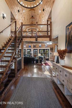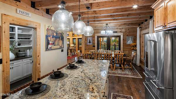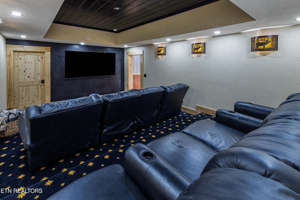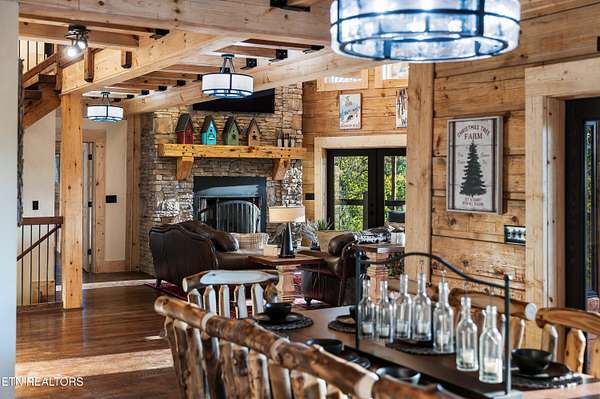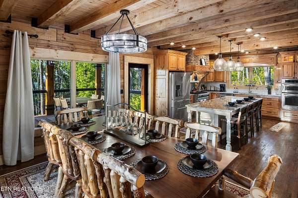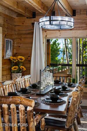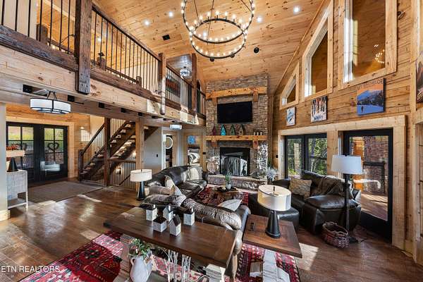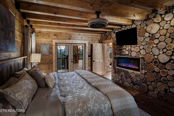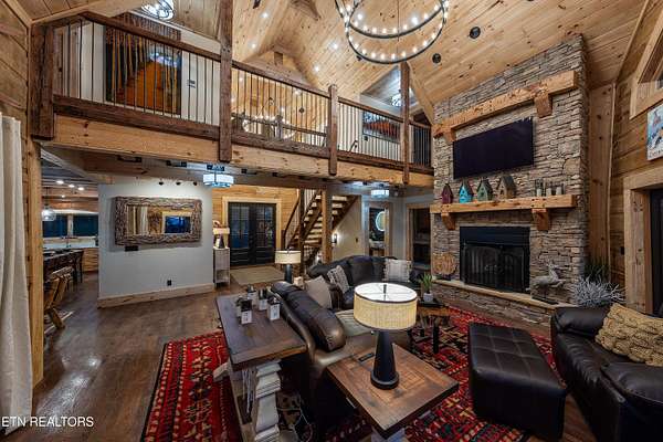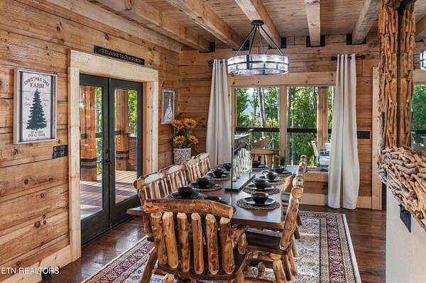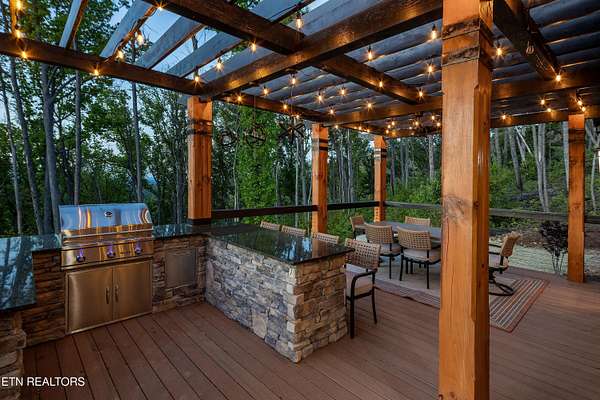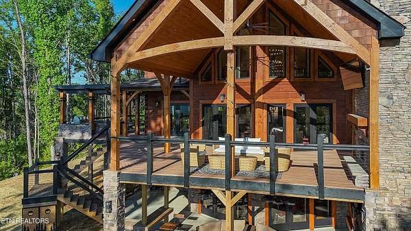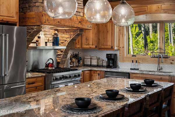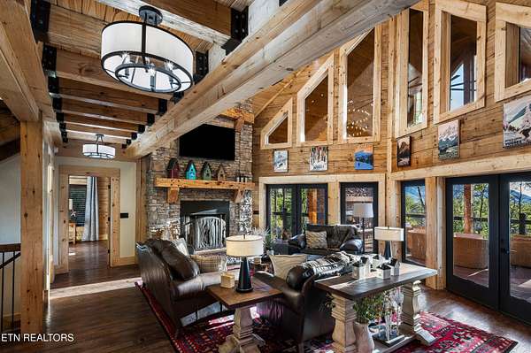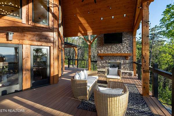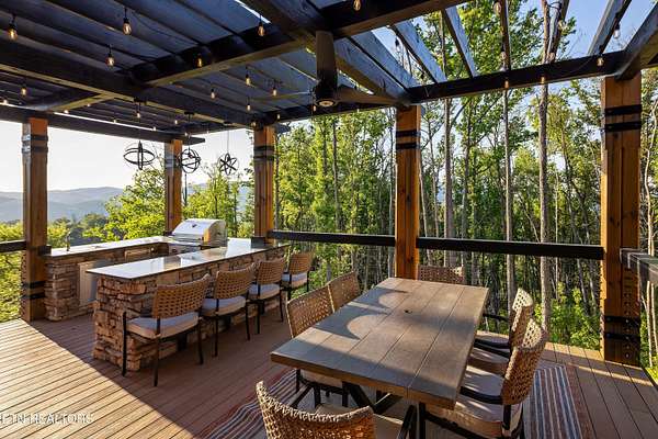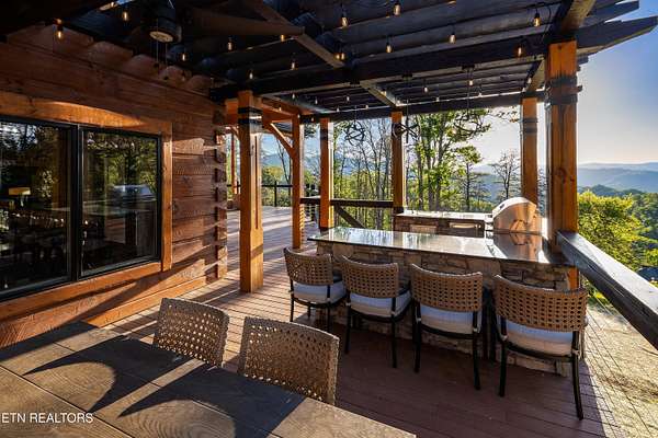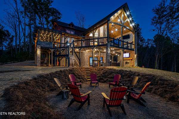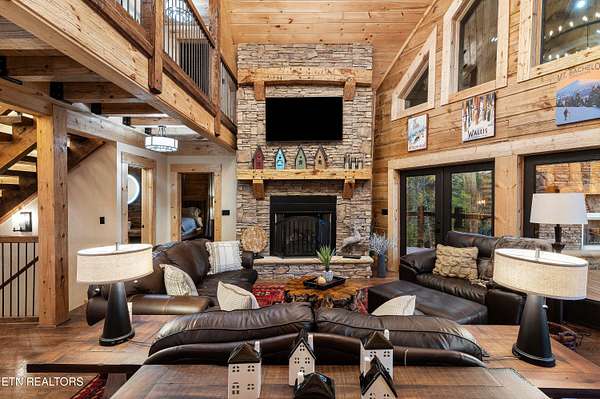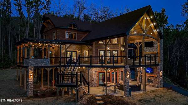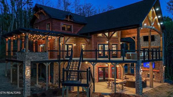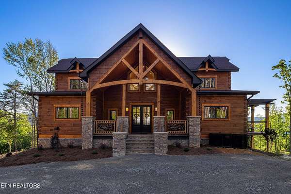 Welcome to 2203 Ridgeland View Lodge: Winner of the prestigious 2025 Silver Award by the Log & Timber Home Council of the National Association of Home Builders! This recently constructed 4,200 sq. ft. fully furnished craftsman styled log home, with captivating mountain views, boasts 2,000 sq. ft. of Trex decking on almost 2 acres and comes with a life-time timber warranty for both first and second homeowners. Tucked away in the gated Resort and Estate community of Shagbark of East Tennessee, only 15 minutes from downtown Pigeon Forge. The moment you enter through the 8ft mahogany double front door you'll be captivated by the grandeur of the open living floor plan that is showcased by beautifully appointed furnishings, cathedral ceilings, Anderson casement black windows, and the gas stone fireplace for those cozy cool evenings. Inside we have three bedrooms, one office / sleeping area, 3 full bathrooms, 2 half baths, game room, home theater, 2 kitchens (indoor and outdoor), four (4) gas fireplaces: one in great room, two in each of the outdoor living spaces and one in the master bedroom. The main floor master suite has a private entrance to the deck, a luxurious master bath with dual sinks, large seated custom shower and jetted tub, a gas fireplace, and a decorative wood wall with mounted tv. Upstairs are two additional bedrooms each with a full bath and mountain views. The high-end gourmet kitchen is complete with KitchenAid stainless-steel appliances, a gas range, endless granite countertop space, custom cabinetry, a large island for meal prep and/or eat in dining and butler pantry with washer/dryer hookup. The Amish crafted dining room adjacent seats 10 for dining. This home was designed to transitionfrom indoor living and entertaining seamlessly to the outdoors. Outside on the side deck is a second outdoor kitchen with a gas grill, beautiful stone and granite countertops and seating for ten or more. A wonderful way to begin your day with coffee surrounded by nature. Moving to the lower living level you find a large home theater room with extra storage, a fully furnished game area with a half bath and an office / flex or sleeping area with 3 bunk beds. Just outside is a covered deck area with tv and stone fireplace. To the right a Hot Tub is located. Down the hill a short distance is a gas firepit with outdoor seating. Shagbark Resort has a community outdoor pool, tennis court, and club house, dog park and playground for owners and guests. Builder has the property on an overnight short-term rental program since being built. Easily sleeps 12 persons. Buried 1000-gal propane tank. Internet by Starlink.
