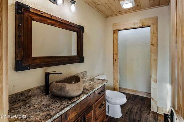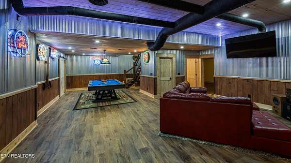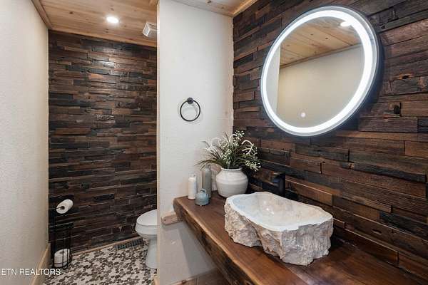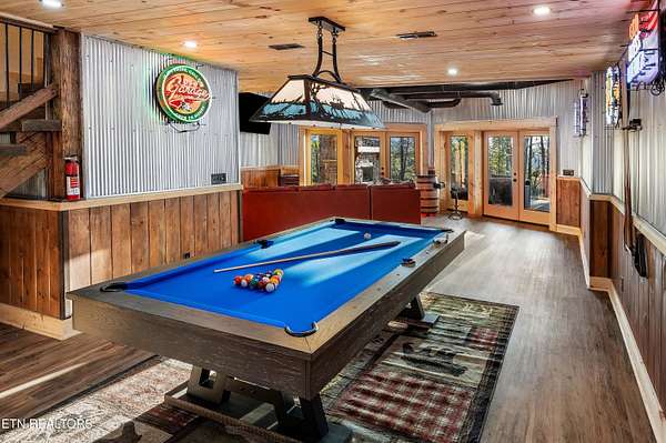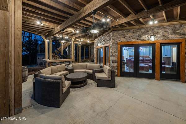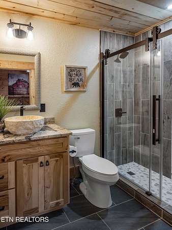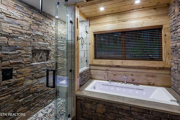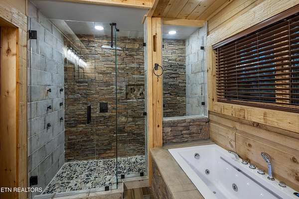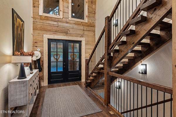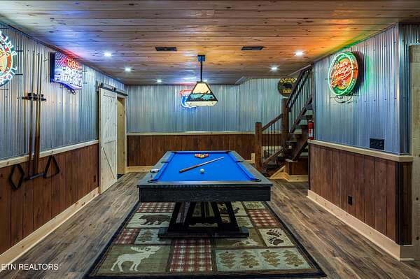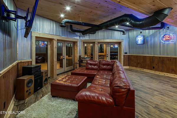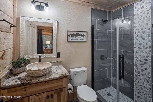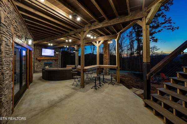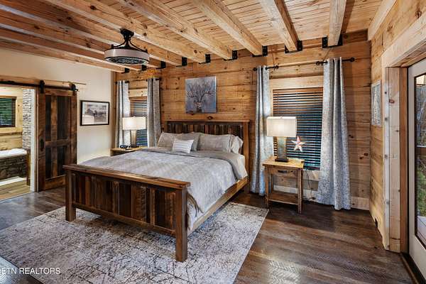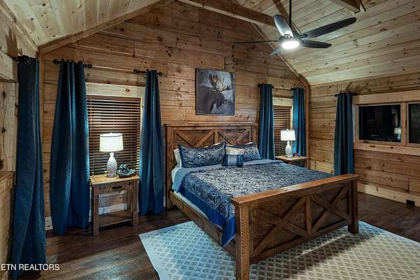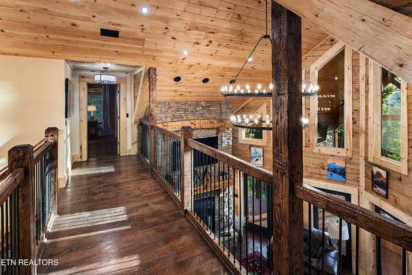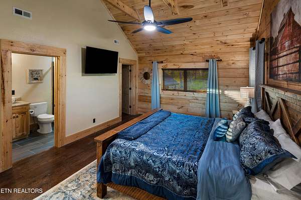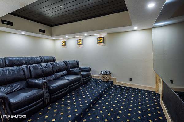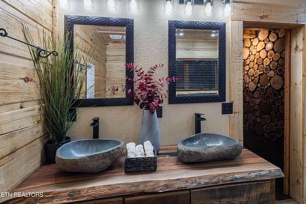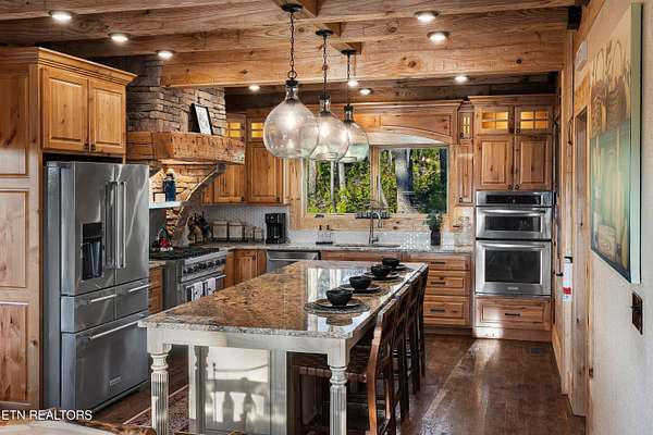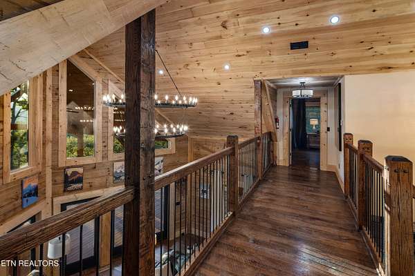 Welcome to 2203 Ridgeland View Lodge: Winner of the prestigious 2025 Silver Award by the Log & Timber Home Council of the National Association of Home Builders! This recently constructed 4,200 sq. ft. fully furnished craftsman styled log home, with captivating mountain views, boasts 2,000 sq. ft. of Trex decking on almost 2 acres and comes with a life-time timber warranty for both first and second homeowners. Tucked away in the gated Resort and Estate community of Shagbark of East Tennessee, only 15 minutes from downtown Pigeon Forge. The moment you enter through the 8ft mahogany double front door you'll be captivated by the grandeur of the open living floor plan that is showcased by beautifully appointed furnishings, cathedral ceilings, Anderson casement black windows, and the gas stone fireplace for those cozy cool evenings. Inside we have three bedrooms, one office / sleeping area, 3 full bathrooms, 2 half baths, game room, home theater, 2 kitchens (indoor and outdoor), four (4) gas fireplaces: one in great room, two in each of the outdoor living spaces and one in the master bedroom. The main floor master suite has a private entrance to the deck, a luxurious master bath with dual sinks, large seated custom shower and jetted tub, a gas fireplace, and a decorative wood wall with mounted tv. Upstairs are two additional bedrooms each with a full bath and mountain views. The high-end gourmet kitchen is complete with KitchenAid stainless-steel appliances, a gas range, endless granite countertop space, custom cabinetry, a large island for meal prep and/or eat in dining and butler pantry with washer/dryer hookup. The Amish crafted dining room adjacent seats 10 for dining. This home was designed to transitionfrom indoor living and entertaining seamlessly to the outdoors. Outside on the side deck is a second outdoor kitchen with a gas grill, beautiful stone and granite countertops and seating for ten or more. A wonderful way to begin your day with coffee surrounded by nature. Moving to the lower living level you find a large home theater room with extra storage, a fully furnished game area with a half bath and an office / flex or sleeping area with 3 bunk beds. Just outside is a covered deck area with tv and stone fireplace. To the right a Hot Tub is located. Down the hill a short distance is a gas firepit with outdoor seating. Shagbark Resort has a community outdoor pool, tennis court, and club house, dog park and playground for owners and guests. Builder has the property on an overnight short-term rental program since being built. Easily sleeps 12 persons. Buried 1000-gal propane tank. Internet by Starlink.