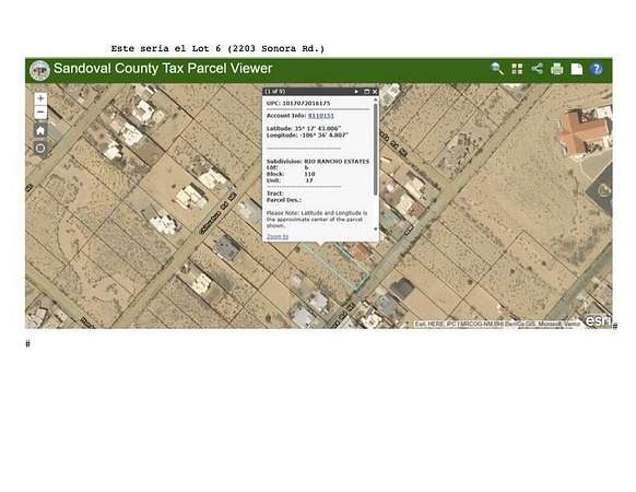 Est $415/moBEAUTIFUL 1/2 ACRE LOT IN PAVED ROAD!! Thinking about building? Look no further! This lot offers mostly level topography and views of the Sandia Mountains and Easy access to Hwy 528! Build the house of your dreams in this centrally located area! Customs homes all around! Rio Rancho is the fastest growing city in NM with a strong driving economy! Utilities in Street! Seller will consider Owner Financing! Do not miss this fantastic opportunity!!