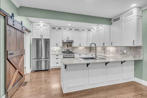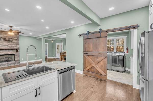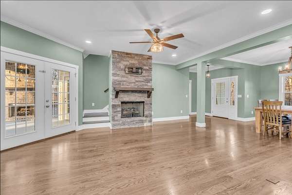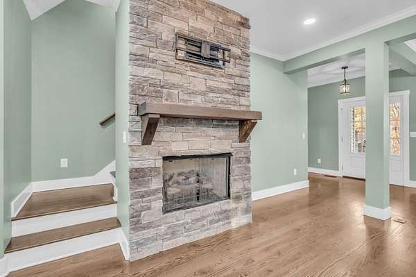 This stunning custom home is filled with thoughtful design and high-end features. The chef's kitchen showcases beautiful custom cabinetry extending to 9-foot ceilings, highlighting the home's refined craftsmanship. An open floor plan provides seamless sightlines between the kitchen, dining area, and living room, all centered around a striking stone fireplace, perfect for everyday living and entertaining.