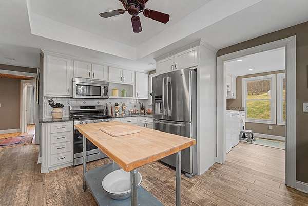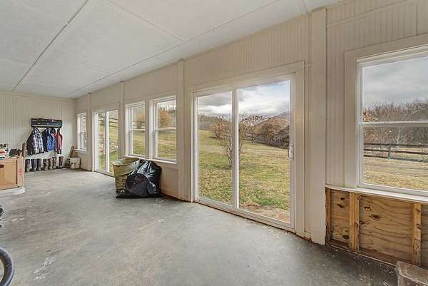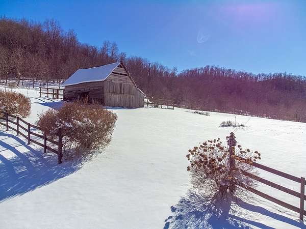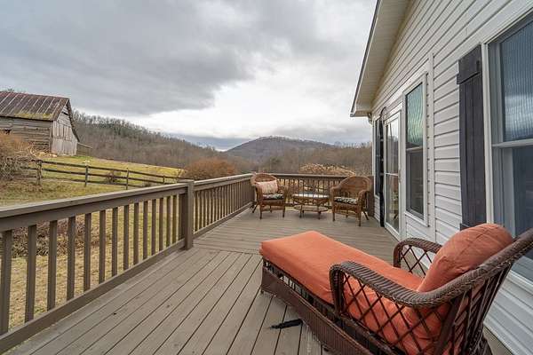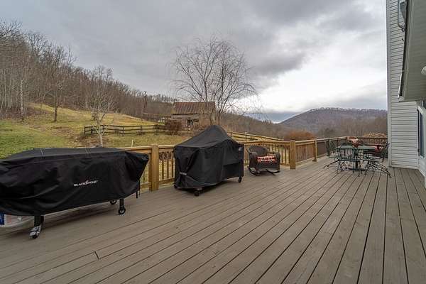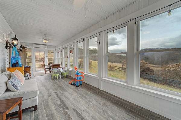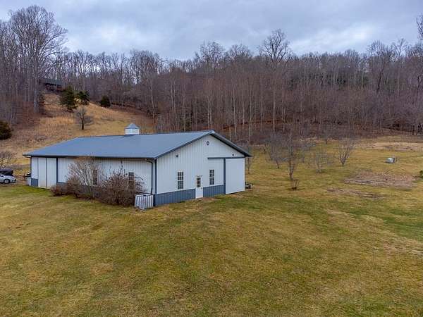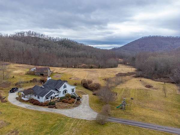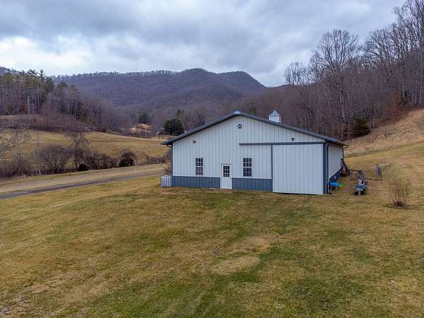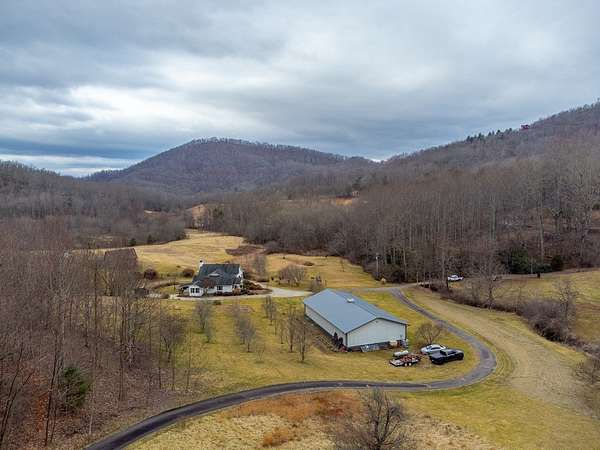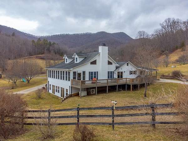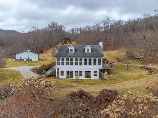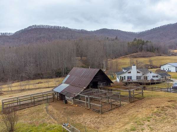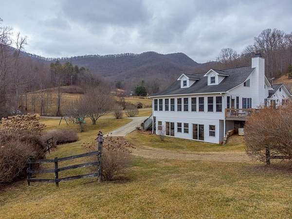 An exceptional high elevation mountain property offering nearly 10 acres at 3,200 feet with sweeping long-range views, bold creek, fruit orchard, lush pasture, and gently rolling, highly usable land. Ideal for those seeking space, privacy, and a true Western NC mountain lifestyle. The modern farmhouse blends warmth and character with thoughtful updates, featuring 4BR/2BA with a loft and an expansive primary suite designed as a private retreat with generous space and comfort. The great room is anchored by a striking rock fireplace, complemented by formal dining and a modern kitchen created for gathering. Flexible living areas include a sunroom ideal for indoor gardening or relaxation, plus a spacious lower level suited for den, office, or recreation. Starlink internet installed. Expansive outdoor living spaces overlook the farm and surrounding mountains. A separate 2BR/1BA log cabin with loft offers privacy for guests or multigenerational living. The impressive 75x42 Morton metal building with backup generator, picturesque functional log barn, greenhouse, and established garden areas complete this rare Western NC mountain homestead built for self-sufficient living.