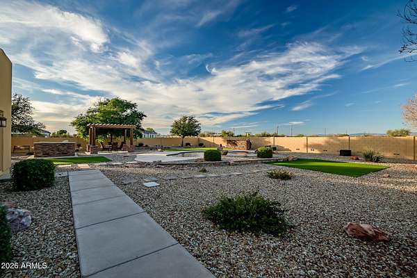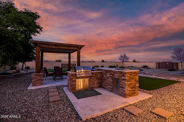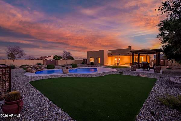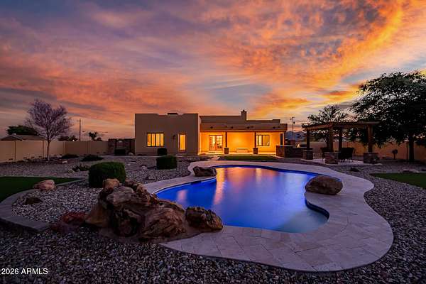 Experience peaceful desert living in this beautifully maintained custom home on 5 acres, showcasing stunning mountain and desert sunset views in every direction. The 3 bedroom plus den, 2 bath layout features high ceilings and thoughtfully designed living spaces. Both the front and backyard are beautifully landscaped, creating a welcoming approach and a serene outdoor retreat. The fenced backyard invites relaxation and entertaining with a pool, travertine pavers, built-in BBQ, and gazebo. With horse and animal privileges, a private well, and abundant open land, this property offers the freedom to dream- whether that means adding equestrian facilities, a guest house, a workshop, or simply enjoying wide open space and privacy.