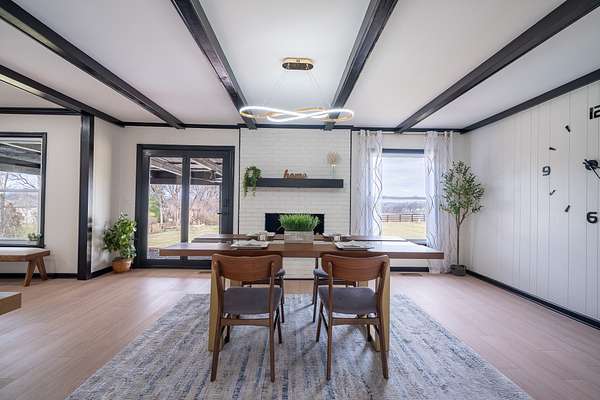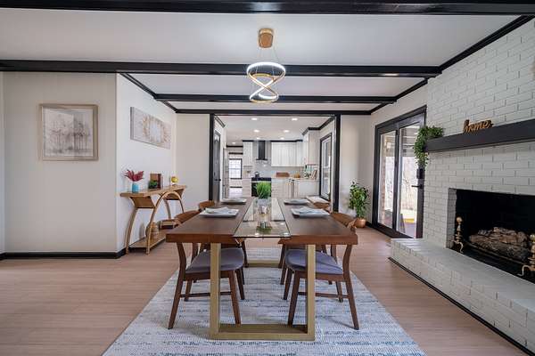 The layout is both practical and inviting. A welcoming foyer opens to the main living areas, including a spacious living room, updated kitchen with new cabinets, countertops, and appliances, and a dining area with a wood-burning fireplace. The bedroom wing includes four bedrooms and two full bathrooms, including the primary suite.